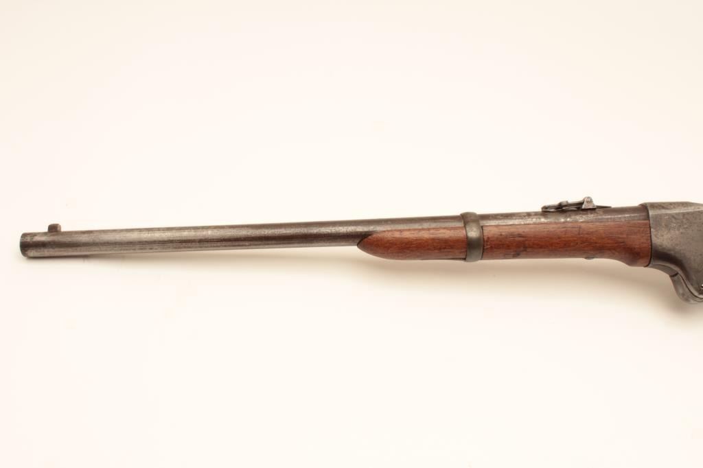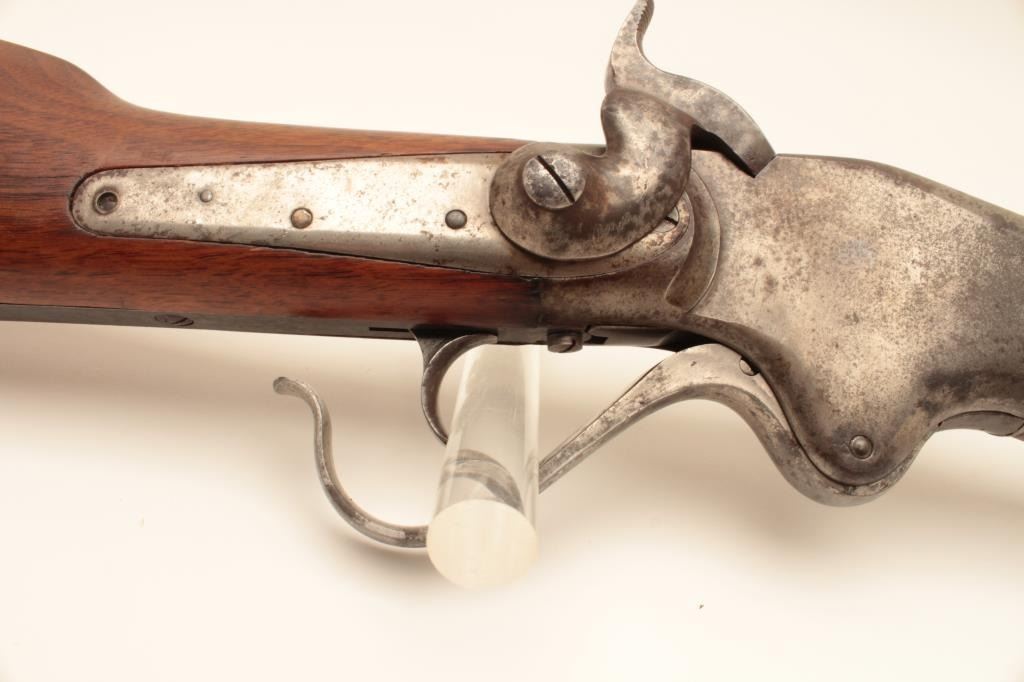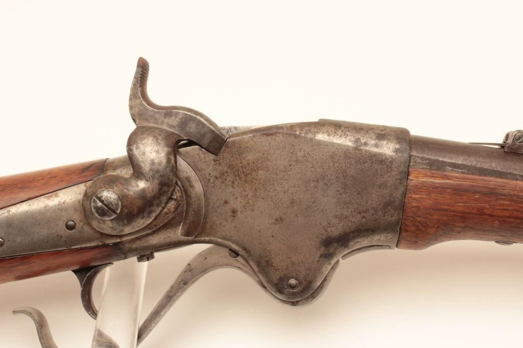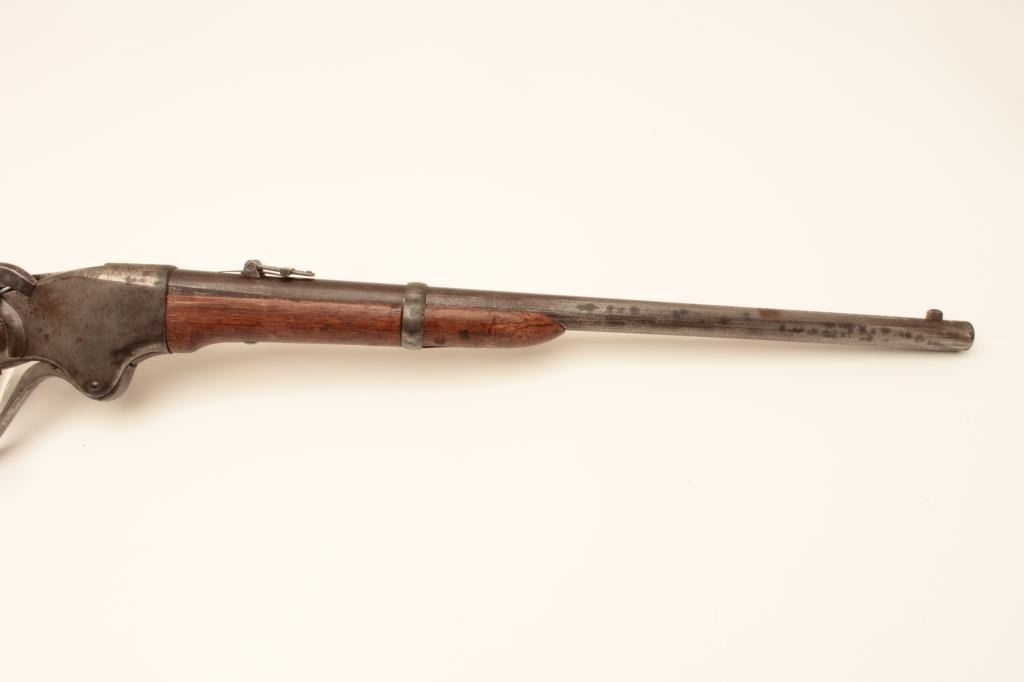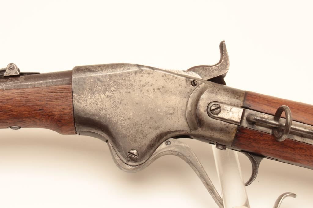 Spencer Saddle Ring carbine, .52 caliber, Serial #19728. The carbine is in good overall condition with a 22” round barrel with a ramped blade front and military ladder style rear sights. The barrel has gone to a mottled silver/brown patina. The receiver has gone to silver patina with some light surface erosion. The hammer and trigger show old, toned case hardening and the saddle ring and bar are retained. The smooth woodstock is in good condition with a “22” engraved into the butt stock. The retaining pin on the magazine is missing. The bore is fair, the action functions and the markings are legible on this desirable Spencer. Est.: $900-$1,800. (Antique).