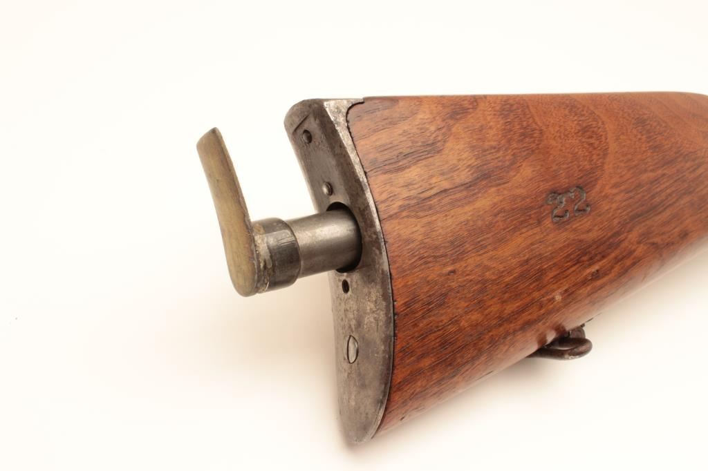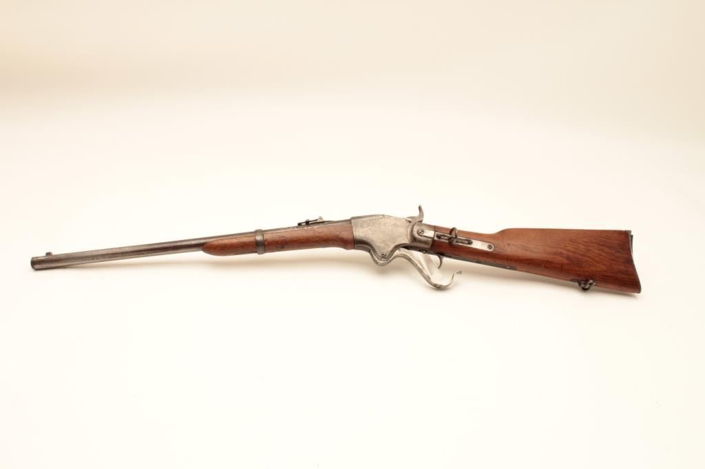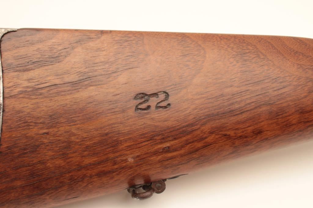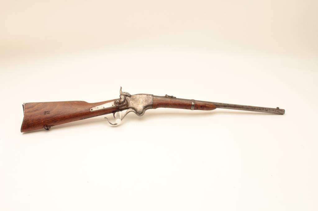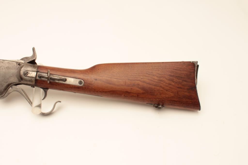Spencer Saddle Ring carbine, .52 caliber, Serial #19728. The carbine is in good overall condition with a 22” round barrel with a ramped blade front and military ladder style rear sights. The barrel has gone to a mottled silver/brown patina. The receiver has gone to silver patina with some light surface erosion. The hammer and trigger show old, toned case hardening and the saddle ring and bar are retained. The smooth woodstock is in good condition with a “22” engraved into the butt stock. The retaining pin on the magazine is missing. The bore is fair, the action functions and the markings are legible on this desirable Spencer. Est.: $900-$1,800. (Antique).