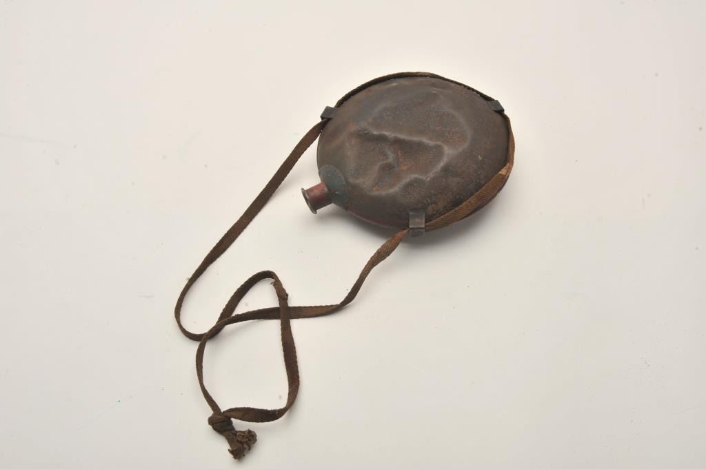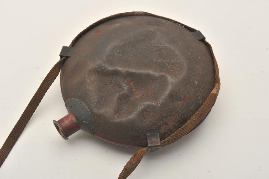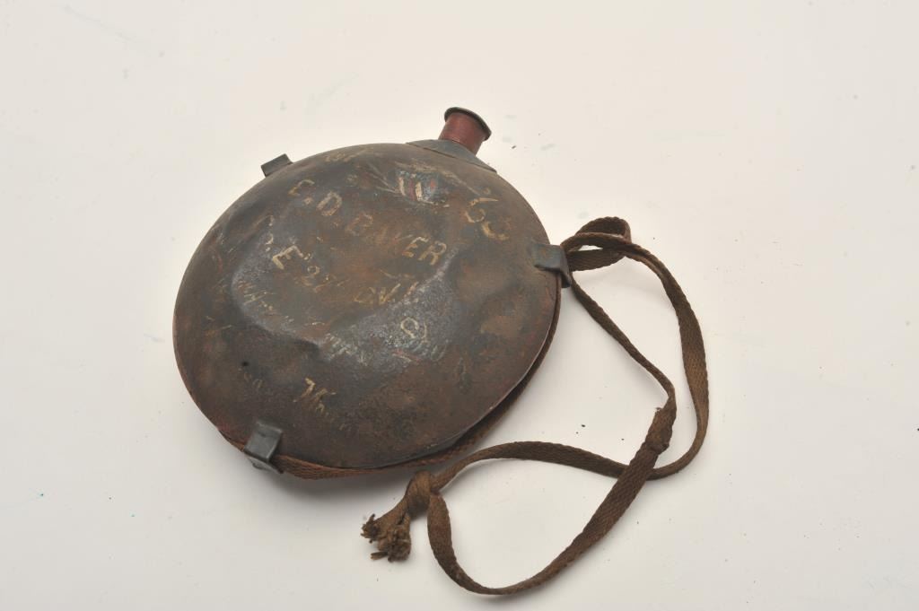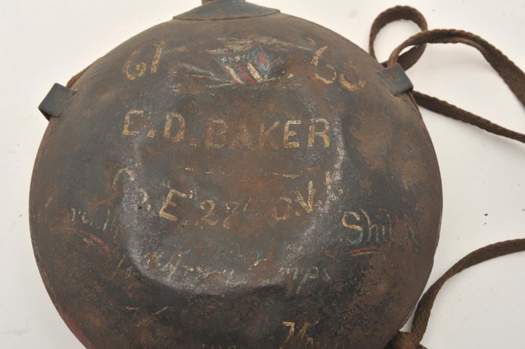 Metal circular Civil War era canteen with woven fabric carry strap, approximately 8” in diameter with painted inscription: “61-red, white and blue chevron-65/E. D. Baker/Co. “E” 27th O.V.I./Shiloh/Kennesaw Mountain” and other markings partially visible; heavy dark patina to canteen with partial red painted trim to body and spout; many old dents; partial old cork stopper remains. Accompanied by copies of service and pensionrecords from the National Archives indicating Emanuel D. Baker was a Private in the 27th Ohio Infantry, enlisting on Aug. 1, 1861, mustering into the Veteran Vols. on Dec. 31, 1863; saw service in Missouri, Tennessee,Mississippi, Georgia and Kentucky until mustering out on July 11, 1865. Est.: $300-$600.