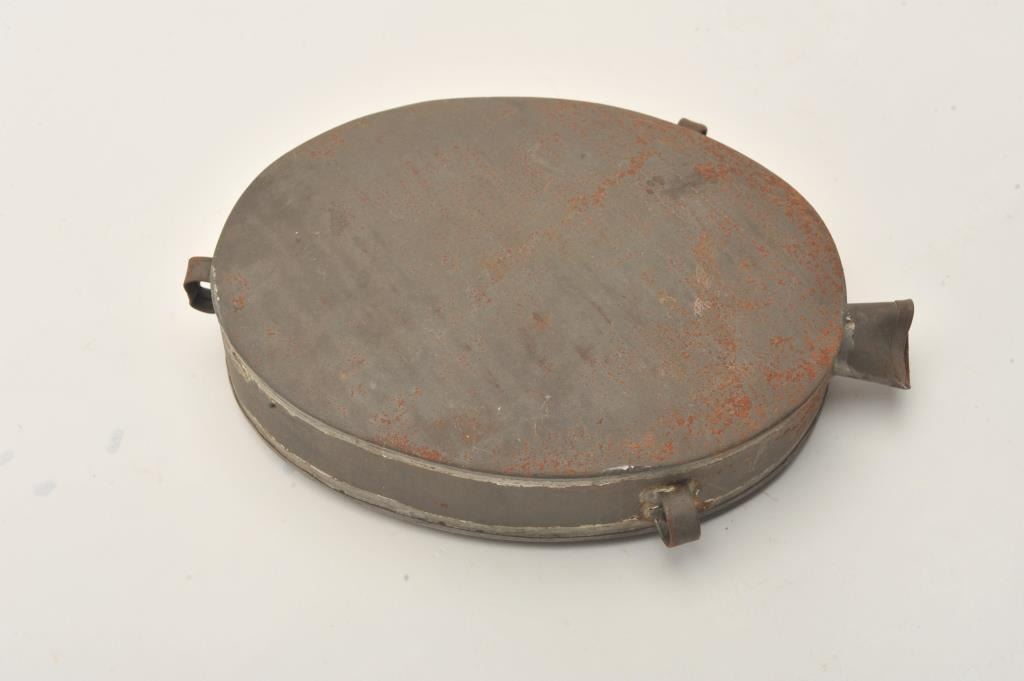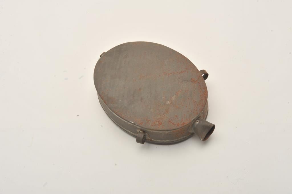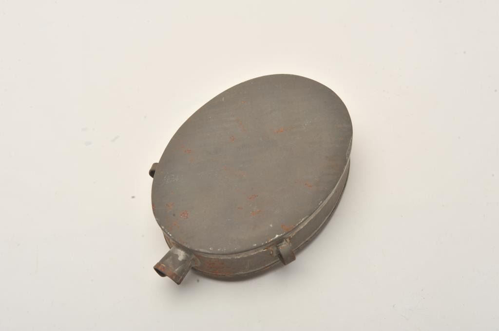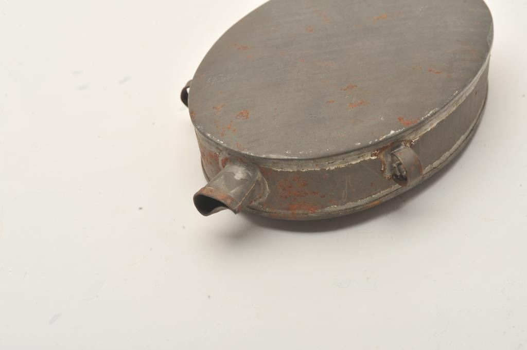 Tin medical style canteen, Civil War era; approximately 7.5” long x 5.5” wide x 1.75” deep, in overall good condition with dented spout. Est.: $150-$300.
