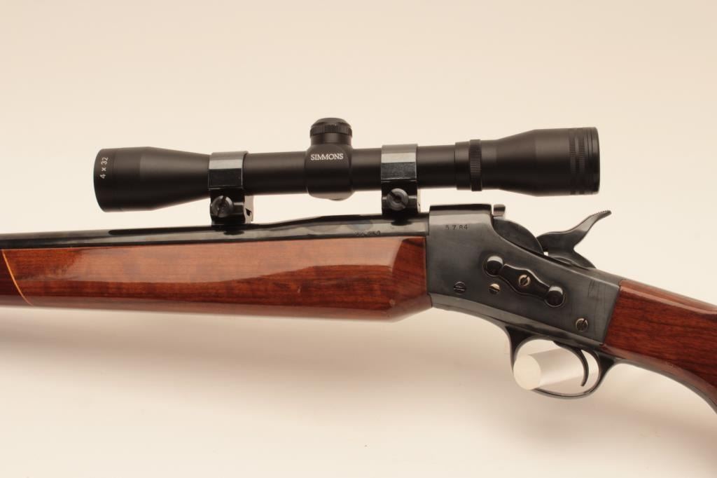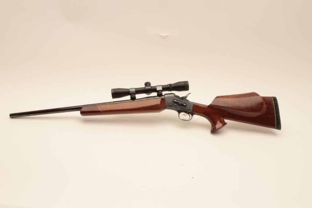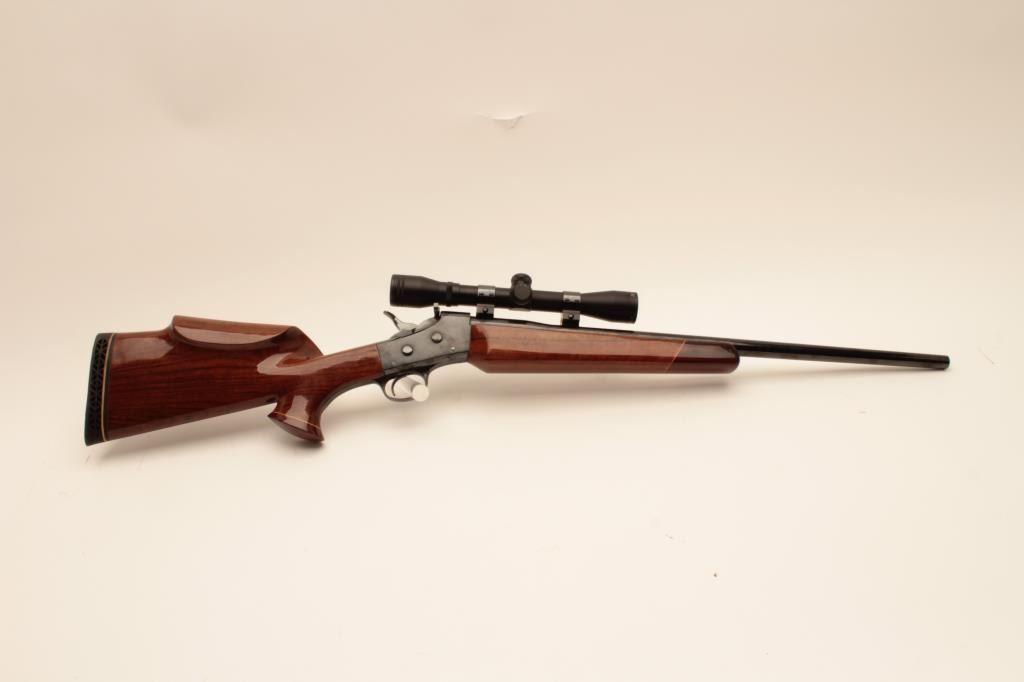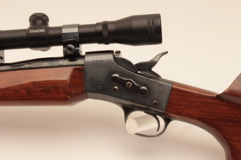 Custom Remington Rolling Block rifle, #5784, .22-250 cal., 24 3/4" tapered barrel, custom Monte Carlo style stock with rubber recoil pad. Rifle is in very good condition as refinished, very good bore, good action,stocks show minor nicks and dings from storage and use. Mounted with a Simmons 4x32 scope with good optics. (C&R) Est. 300-600