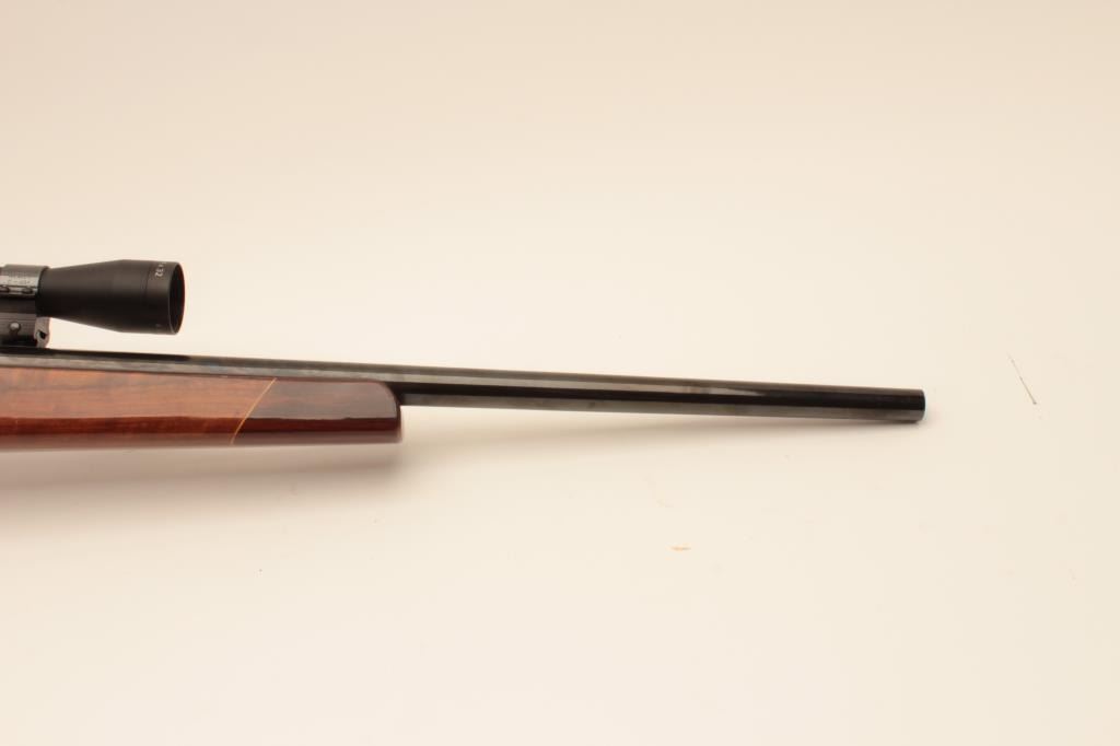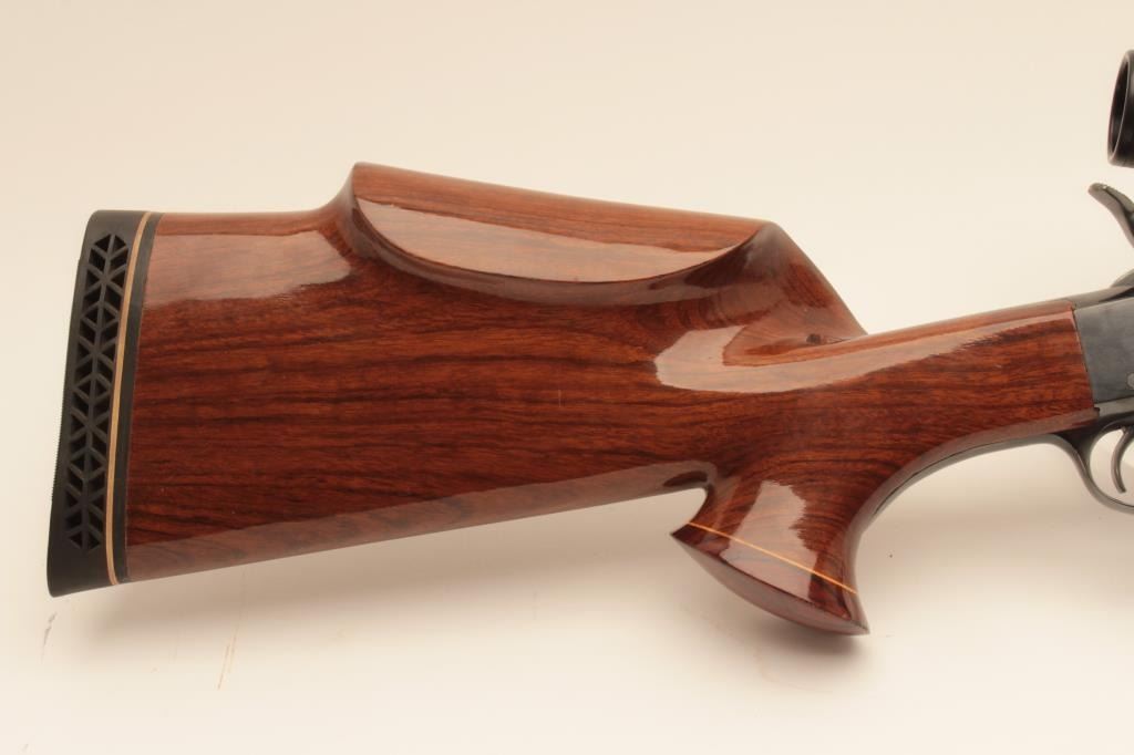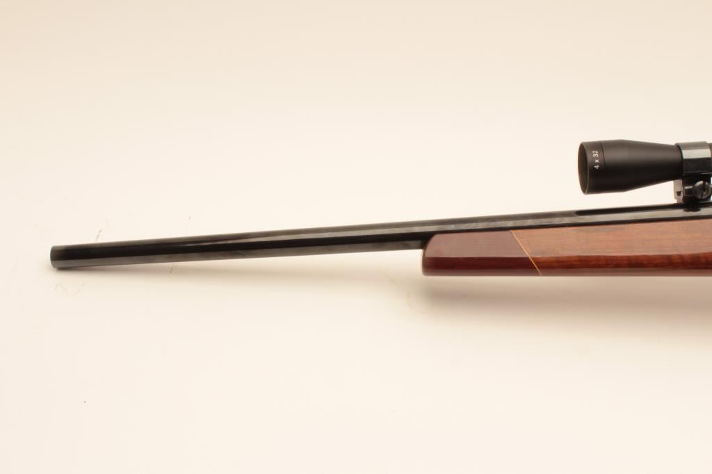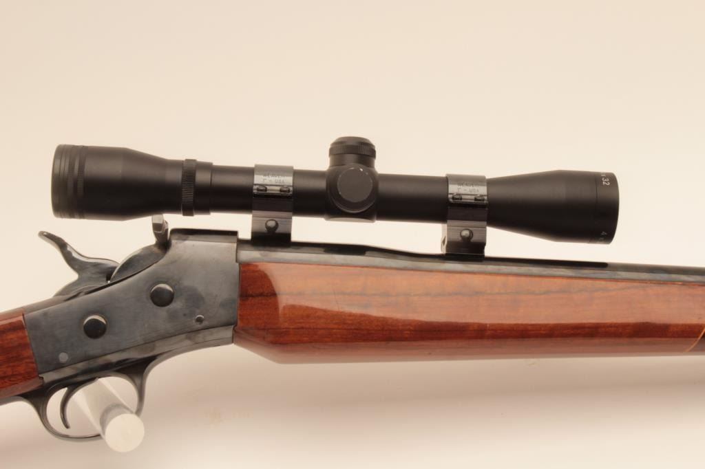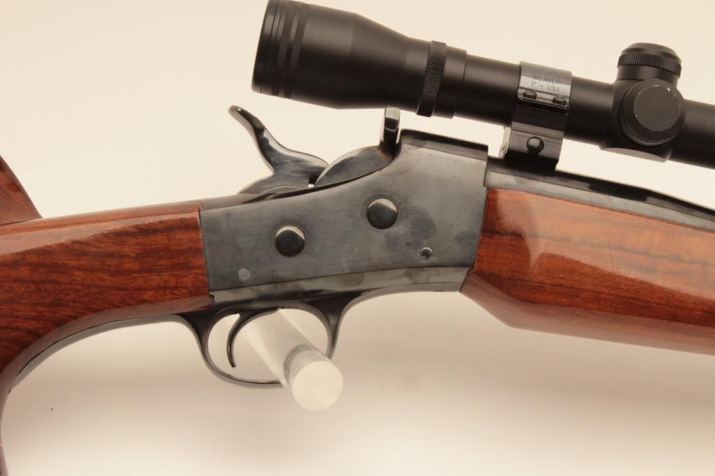 Custom Remington Rolling Block rifle, #5784, .22-250 cal., 24 3/4" tapered barrel, custom Monte Carlo style stock with rubber recoil pad. Rifle is in very good condition as refinished, very good bore, good action,stocks show minor nicks and dings from storage and use. Mounted with a Simmons 4x32 scope with good optics. (C&R) Est. 300-600