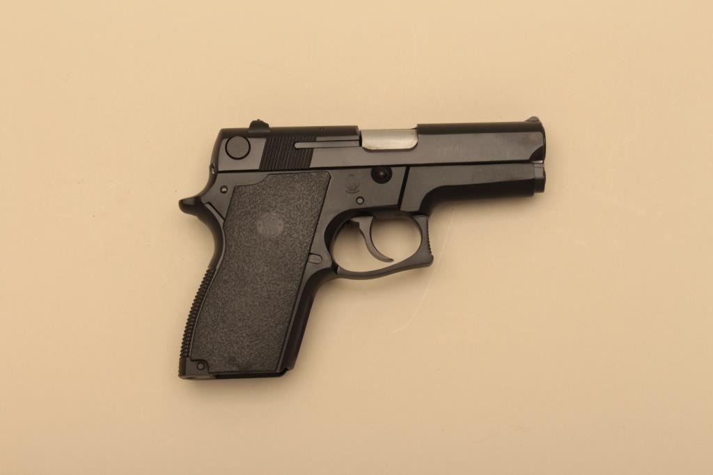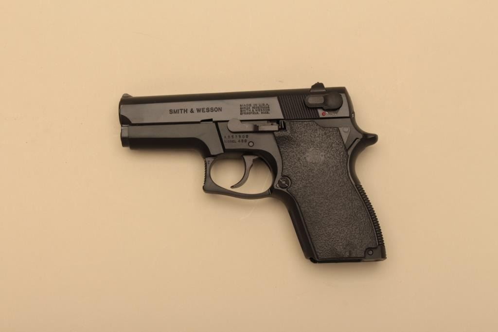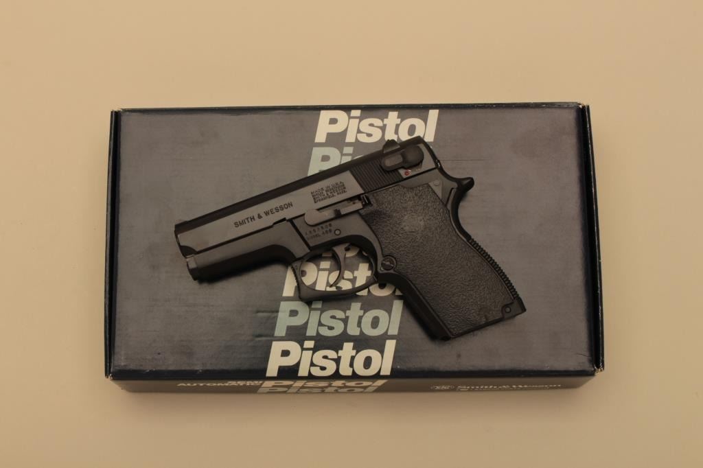 Smith & Wesson Model 469, #A852900, 9mm, 3 1/2" barrel, blued finish, fixed sights, high impact logo plastic grips. Pistol is in fine condition overall, showing 95-98% original finish, mint bore, excellent action, grips are very good. Minor handling marks. Box marked "SJ103102 M469 9MM S/AUT HGN" Includes box, instructions and 2 hi-cap mag (not transferrable to CA or other prohibited states or areas). (Modern/PPT) Est.$400-800