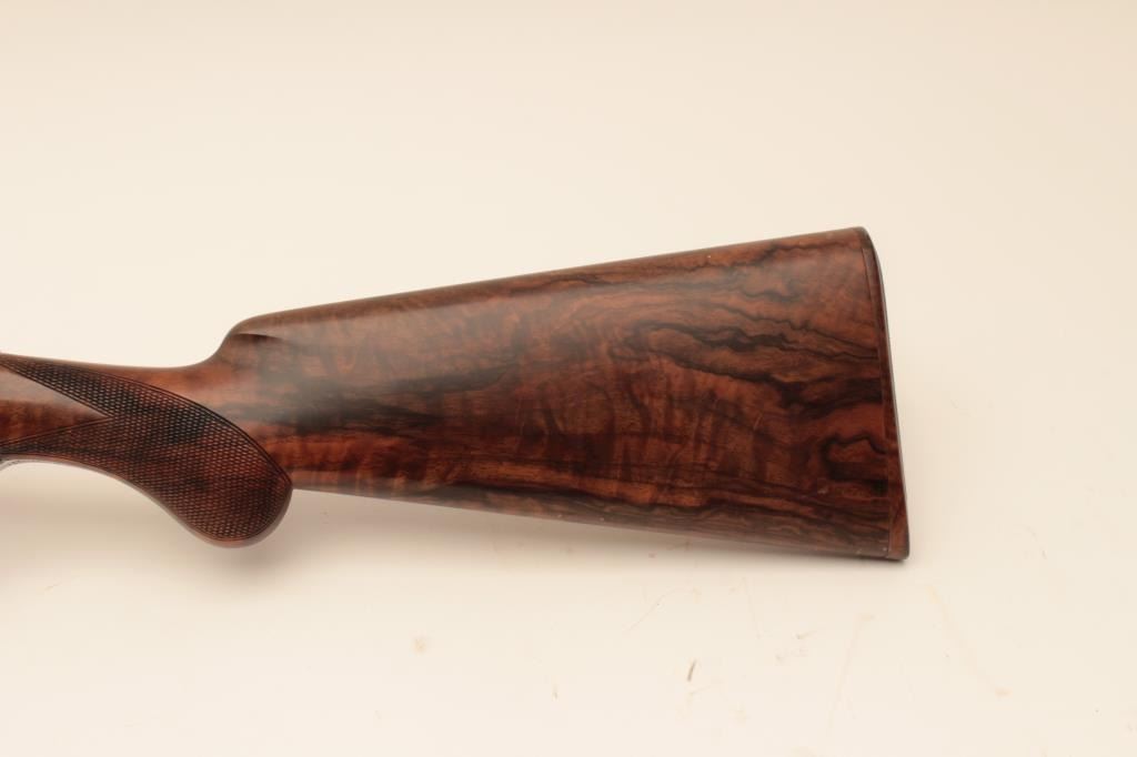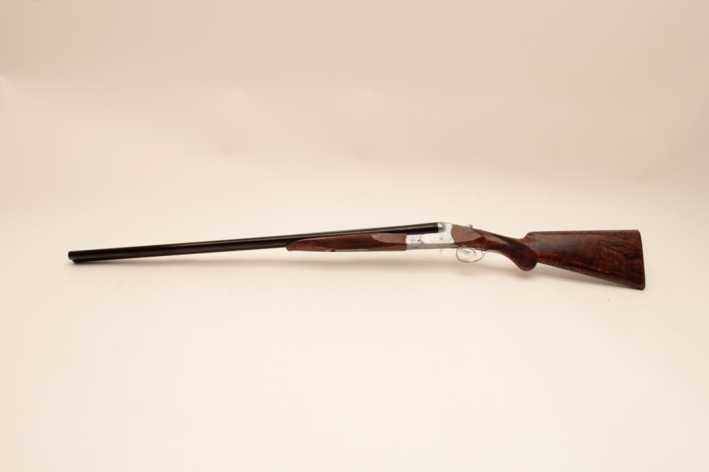 Huglu 2 barrel 20GA “Hunter” set, S/N 03C4187 with 28” and 30” SxS barrels, single trigger, auto ejectors, raised non vent rib and scroll engraved and silver gray finish, and rounded pistol grip. The 28” barrel ischoked full and full. The 30” is choked modified in both barrels. Measures 14 ¼” to end of butt plate. Fine to excellent used condition. 97%-99% overall. With carry case. (Modern) Est.: $2000-$4000