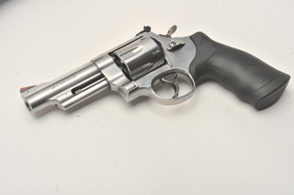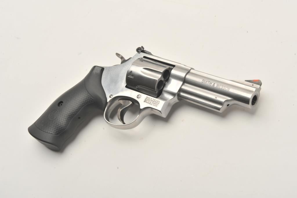 Smith & Wesson Model 869-6 DA revolver, .44 Magnum caliber, 4” barrel, stainless, stippled S&W hard rubber combat grips, S/N CTR8596, in overall fine condition with a fine bore, crisp action, sharp markings andfine grips; accompanied by a factory blue hard carry case. (Modern/PPT). Est.: $750-$1,500.