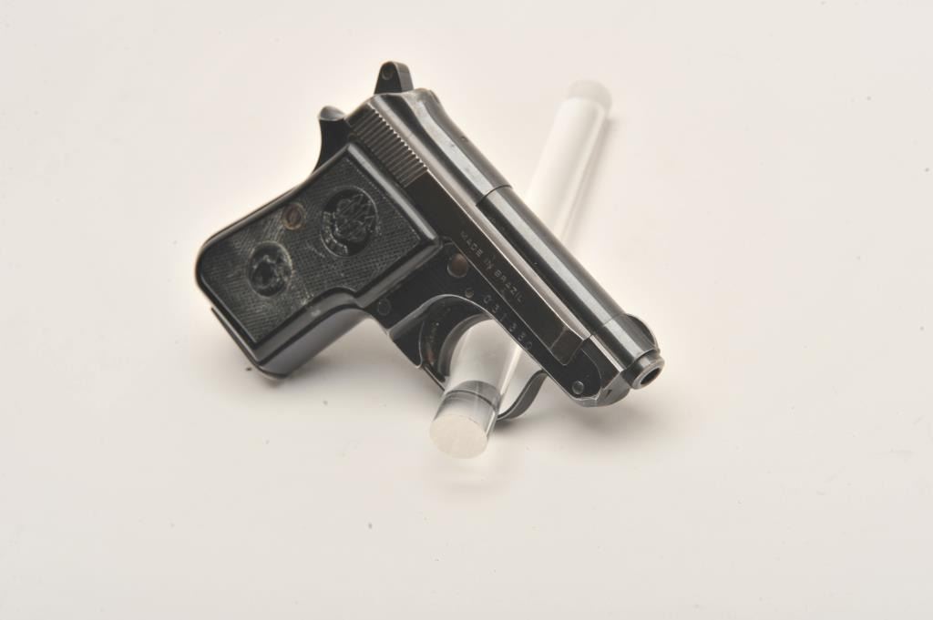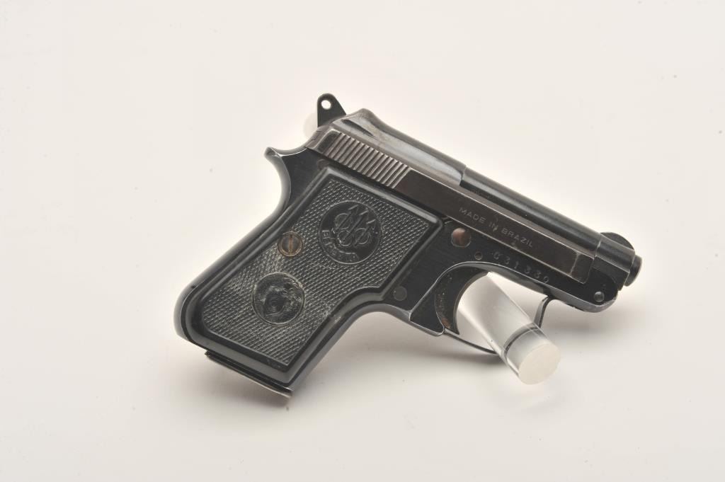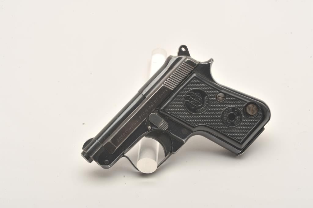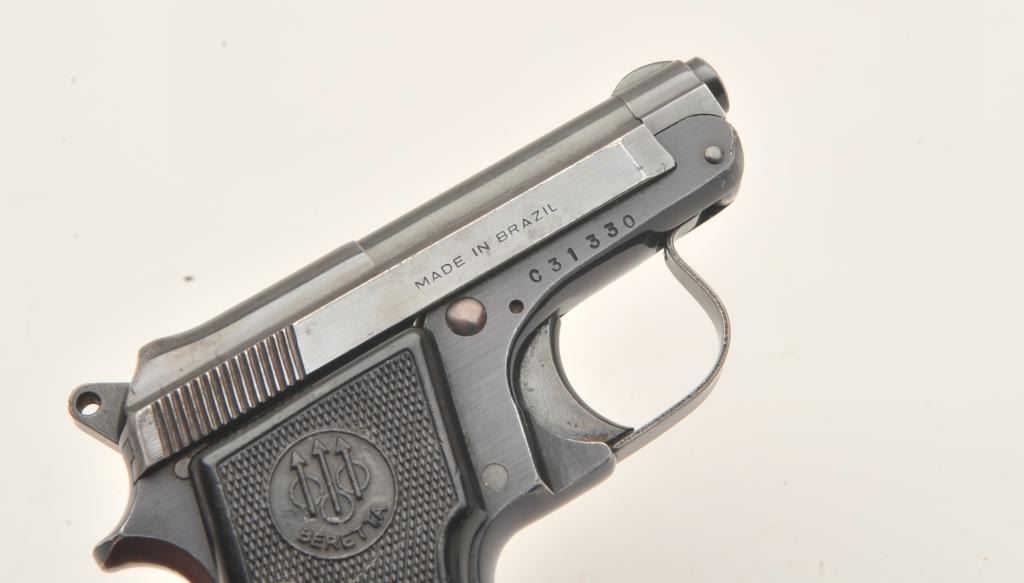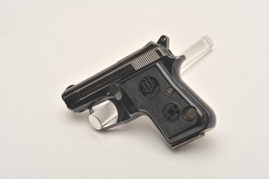 Beretta 950B, #C31330, .22 Short, 2 3/8" tip up barrel, blued with plastic checkered medallion grips. Pistol is in very good condition overall, retaining approximately 85-90% of it's original finish which isthinning, grips are good with no chips or cracks, bore and action are good. One mag. (Modern/PPT) Est. $250-500