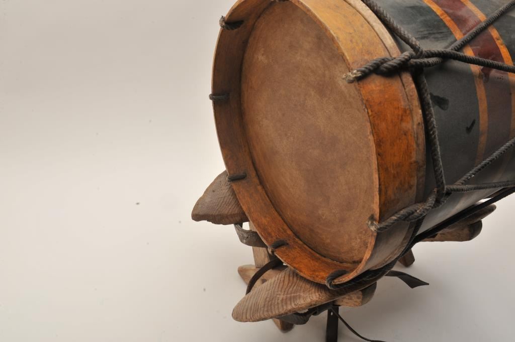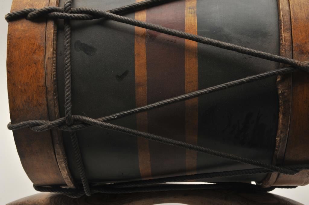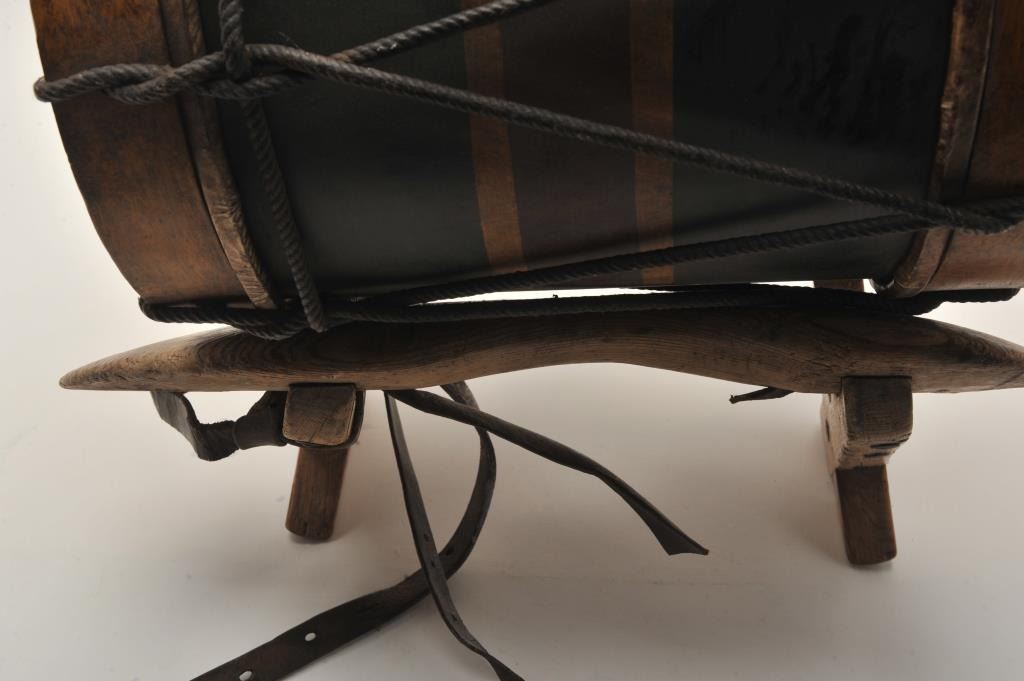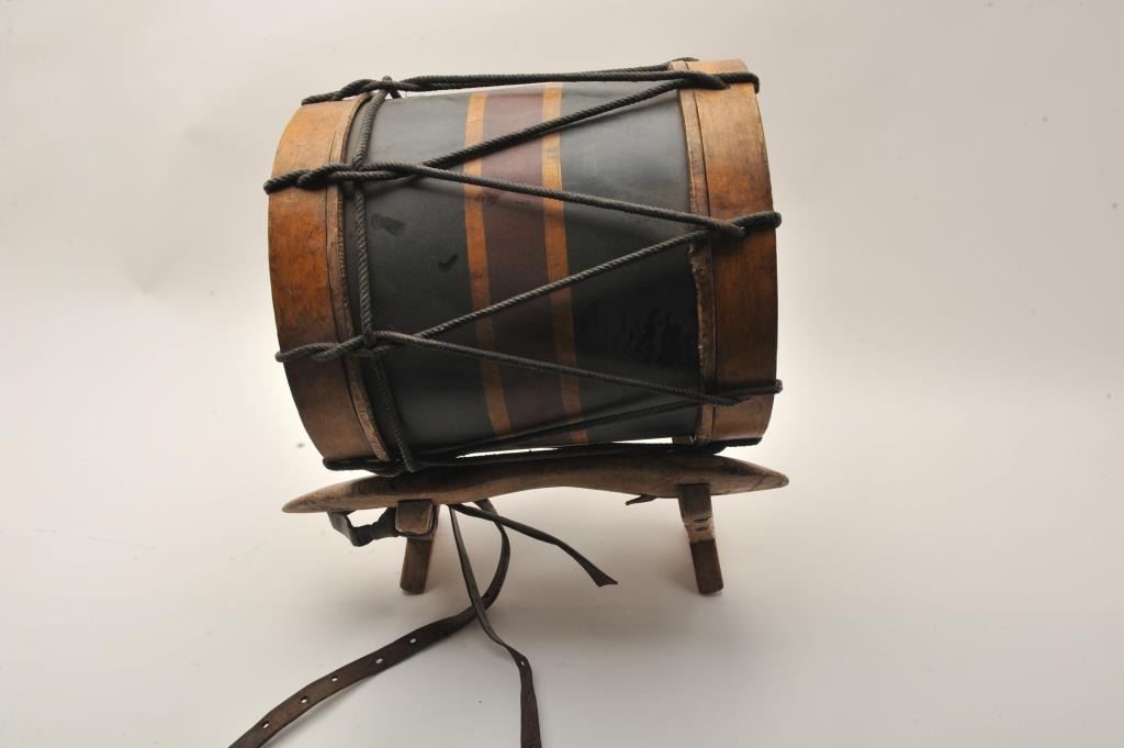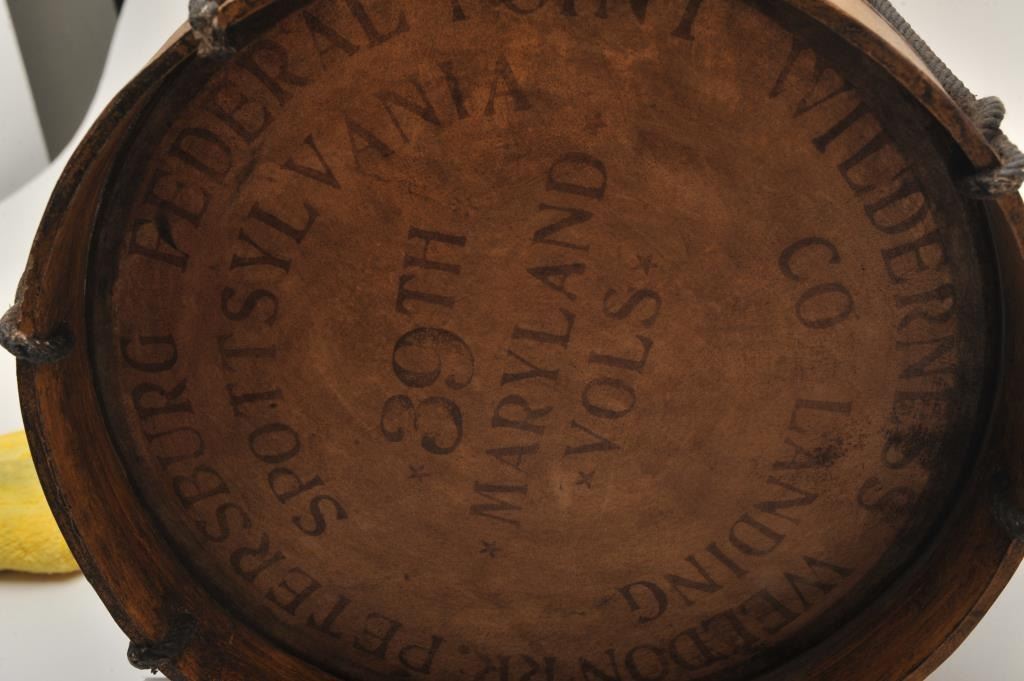 U.S. Colored Troops drum; approximately 15” diameter, 16” high, ca. 1865 or later; head of wood and rope drum is painted as follows: “39th Maryland Vols/Spottsylvania/Co Landing/Petersburg/FederalPoint/Wilderness/Weldon RR”; regiment was officially designated the 39th U.S. Colored Troops and was raised in Baltimore, MD; in addition to battle honors listed on head of drum, the 39th was at the Crater andparticipated in 1865 North Carolina operations. Light wear, nice patina, very good to near fine condition for age. Est.: $750-$1,500+.