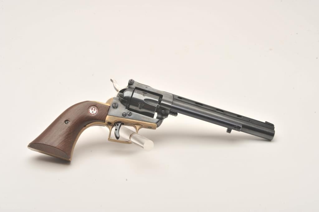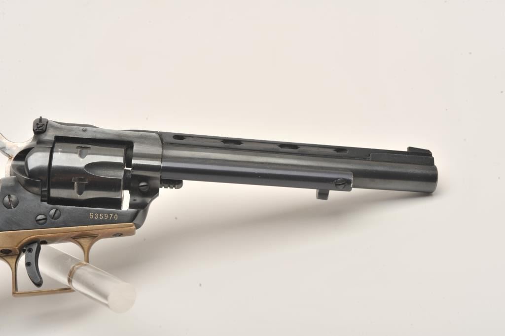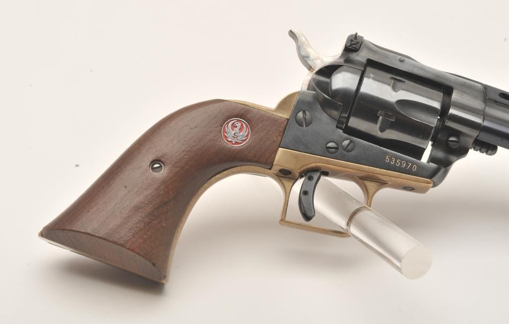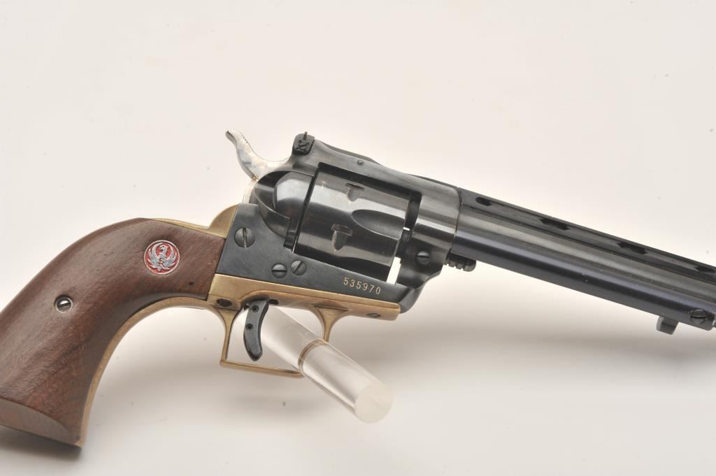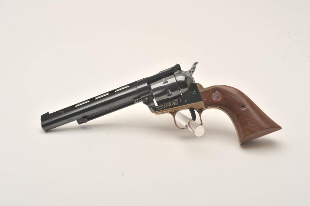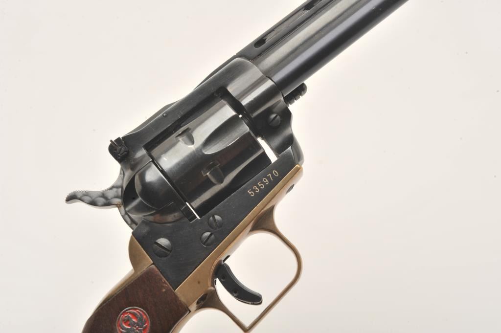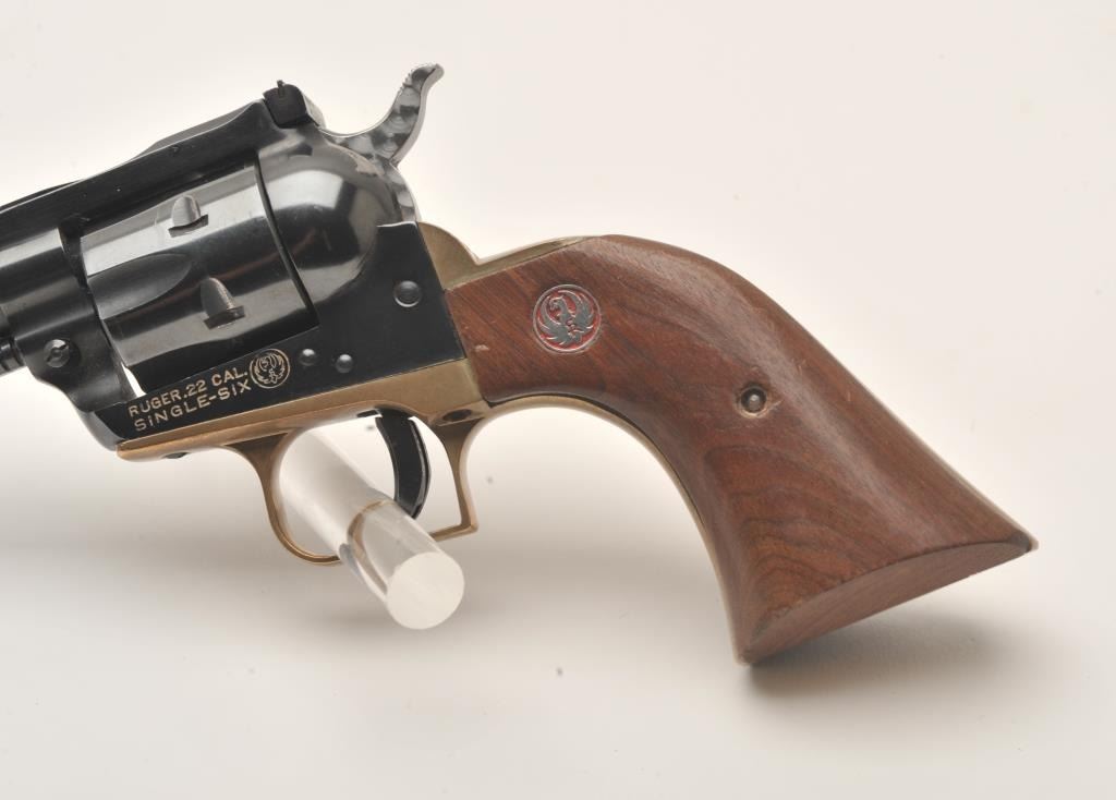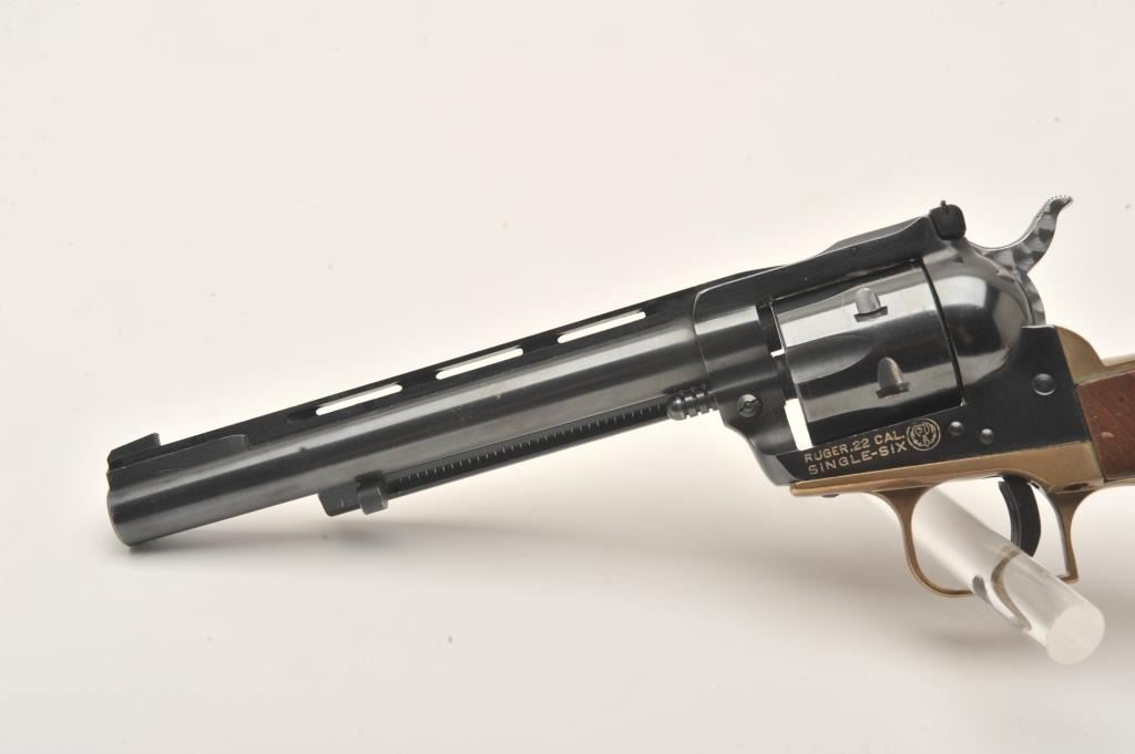 Early Ruger Single Six, #535970, .22 LR, 6.5" vent rib barrel, blued, jeweled hammer, brass backstrap, adjustable sights, smooth wood logo grips. Revolver is in very good condition as upgraded, retaining the majority of it's finish. Bore is very good, action is very good, grips are very good. (C&R/PPT) Est. $200-400