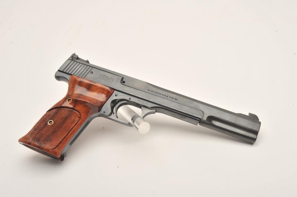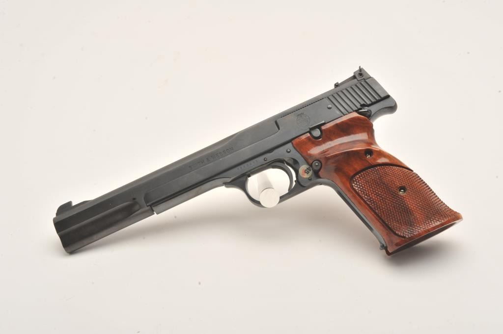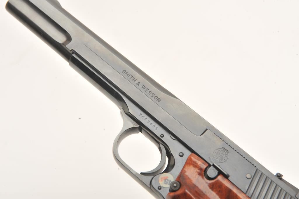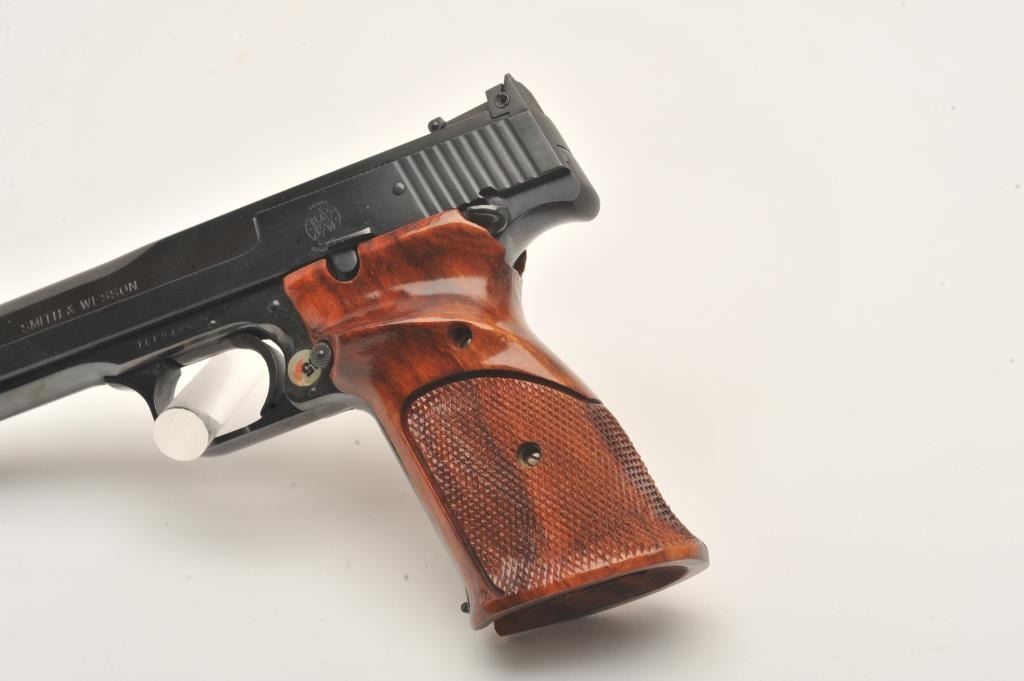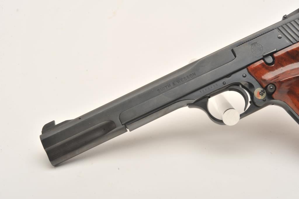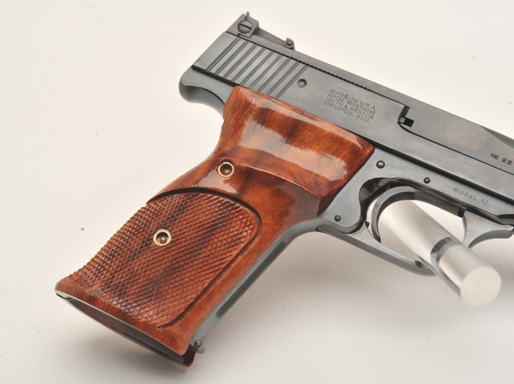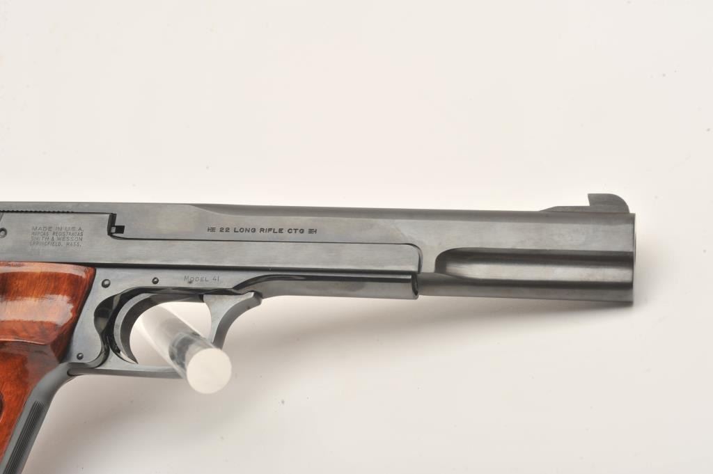 Smith & Wesson Model 41 semi automatic pistol, #TEF9495, .22 LR, 7" barrel, adjustable sights, checkered wood grips. Pistol is in fine to near excellent condition, 96-98% original blue, excellentbore, crisp action, fine grips with crisp checkering. Fantastic target guns and highly sought after. Includes original box numbered to the gun, cleaning kit, 2 mags. (Modern/PPT) Est. $700-1400