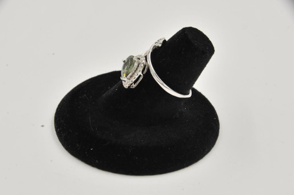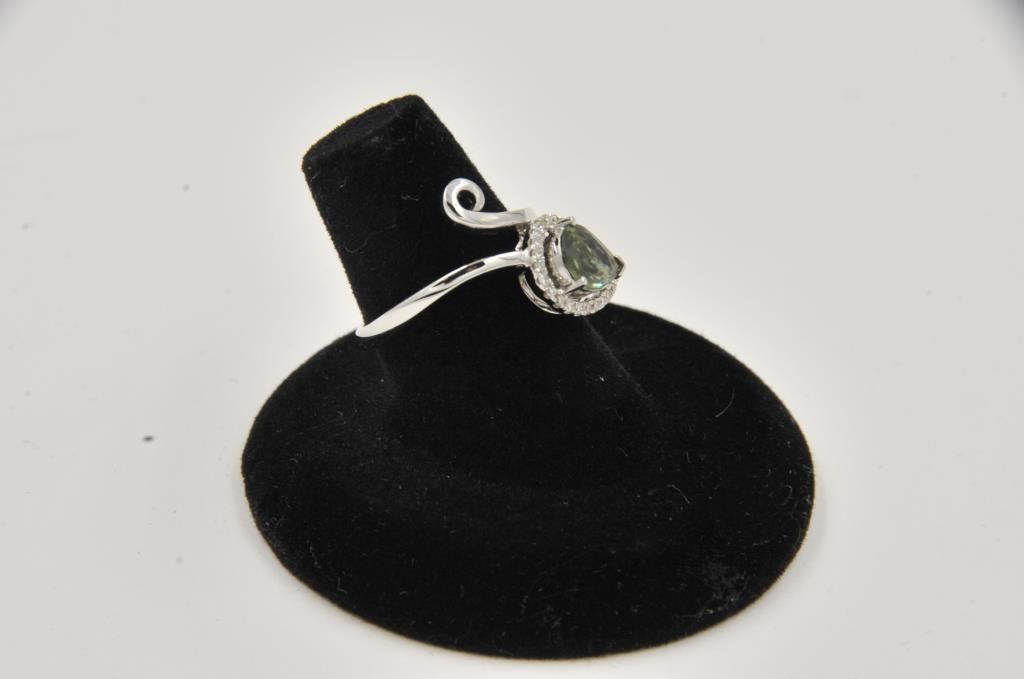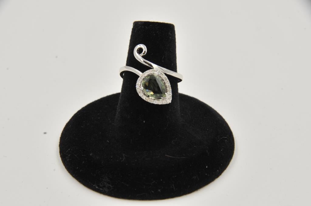 Free form pear shape green sapphire ring surrounded by fine diamonds in 18k white gold. Sapphire 1.5ct Est:$500-600