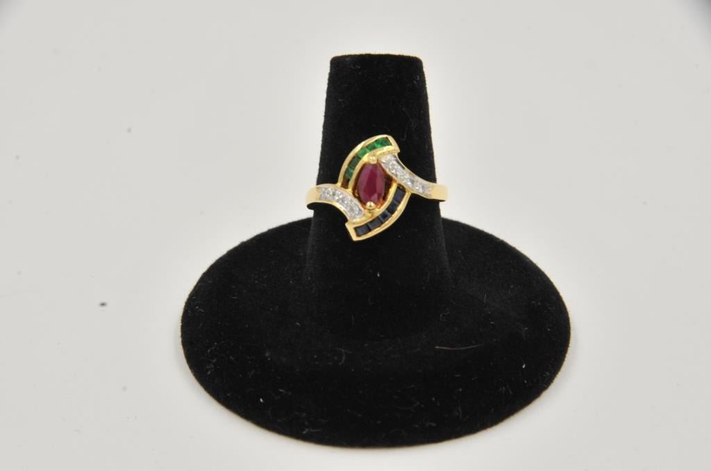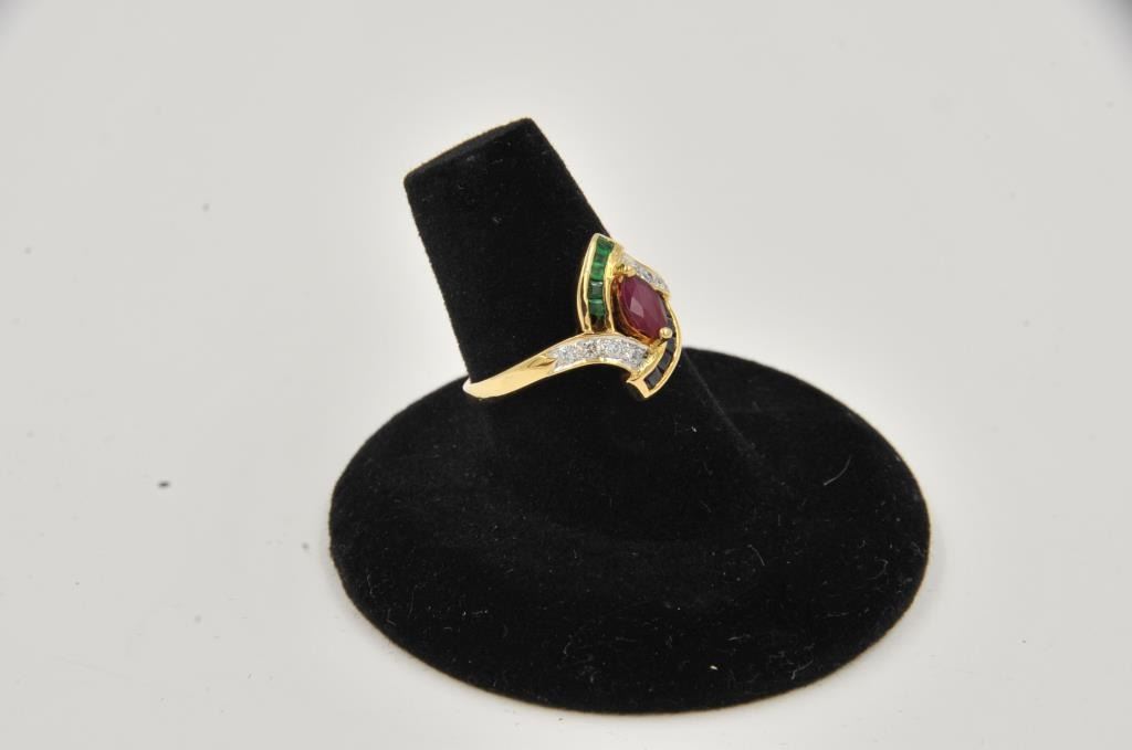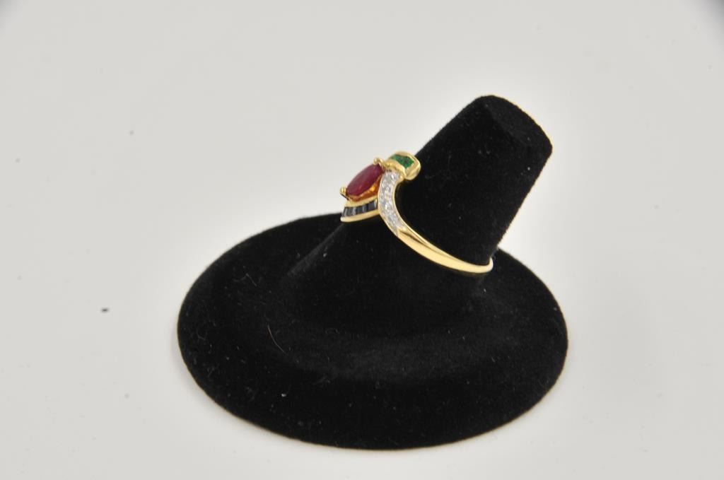 One deco designed ring set with ruby diamond sapphire and emerald in 18k yellow gold Est:$550-650