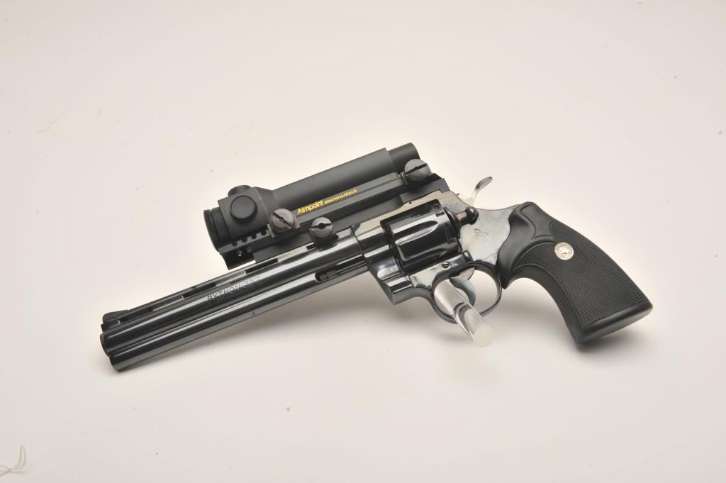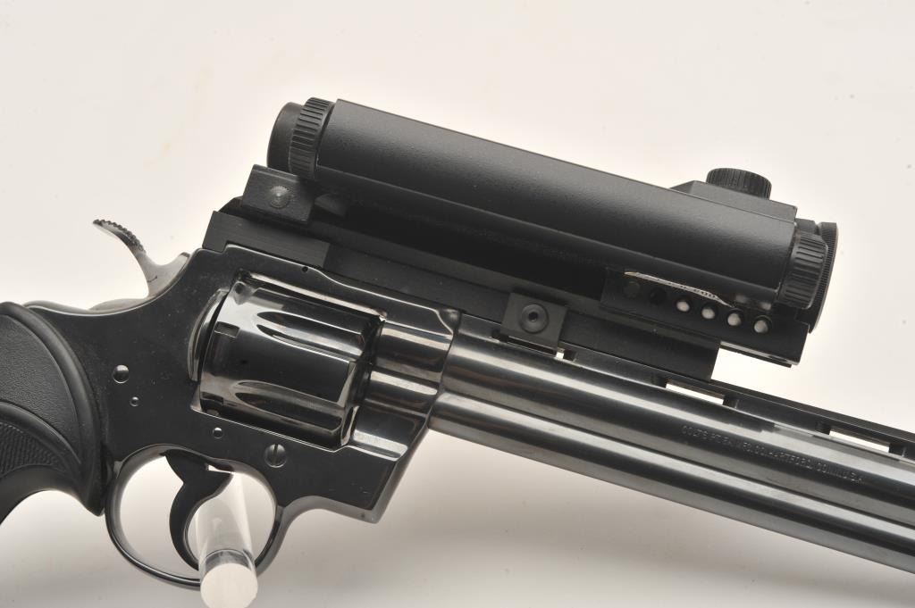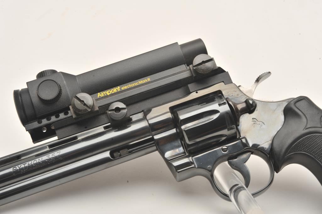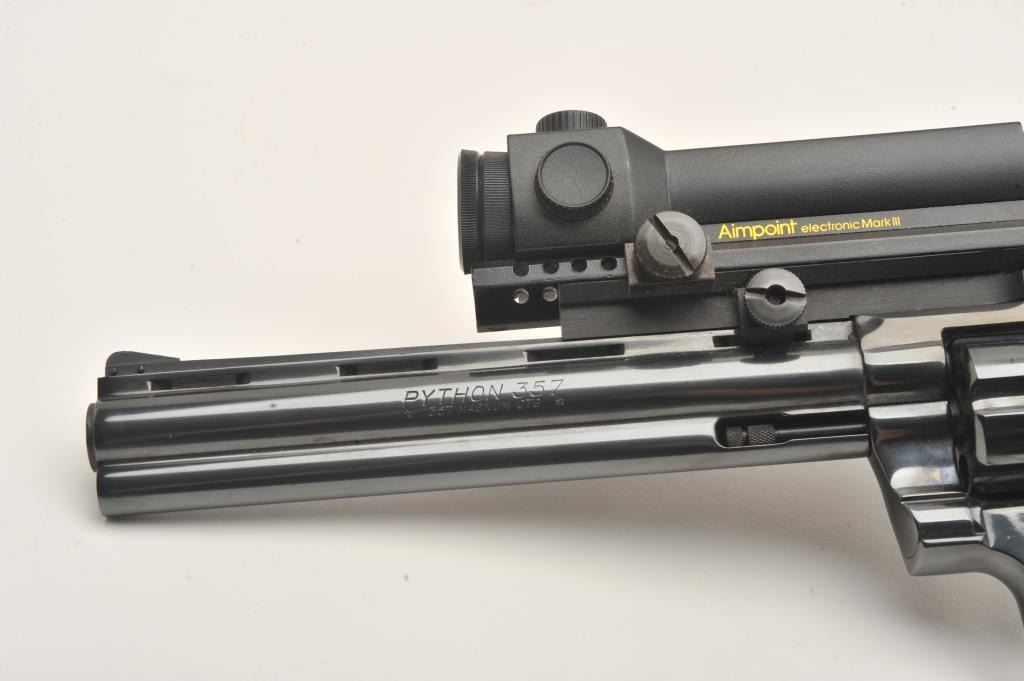 Early Colt Python, #57224, .357 Mag., 8" barrel, Pachmayr Colt logo grips, rear sights removed and Aimpoint Mark III red dot sight added. Revolver is in near excellent condition, retaining approximately 95-98%original finish with just a slight drag line. Bore is excellent, action is excellent. Mfg 1966. (C&R, PPT) Est. $1500-3000