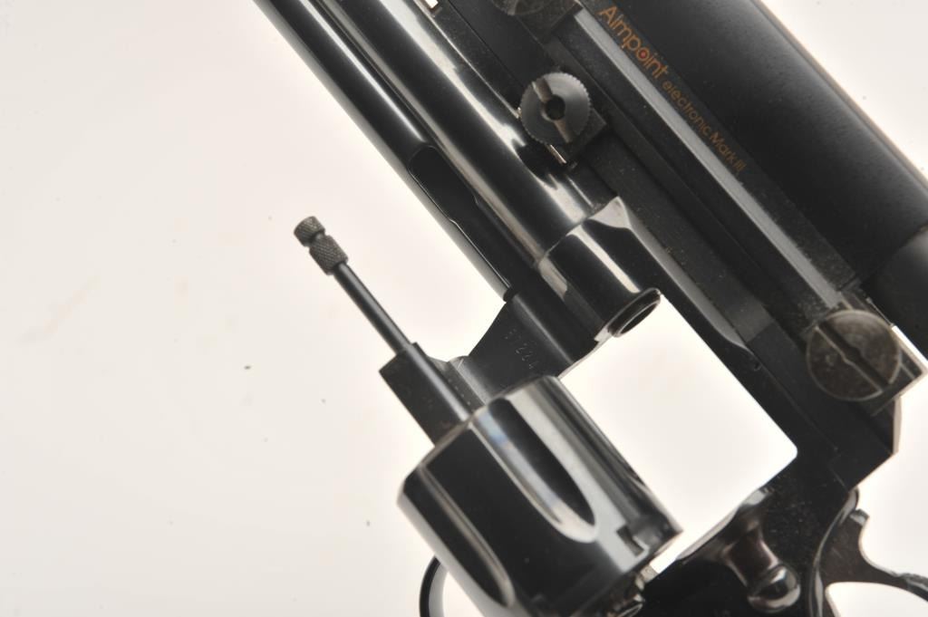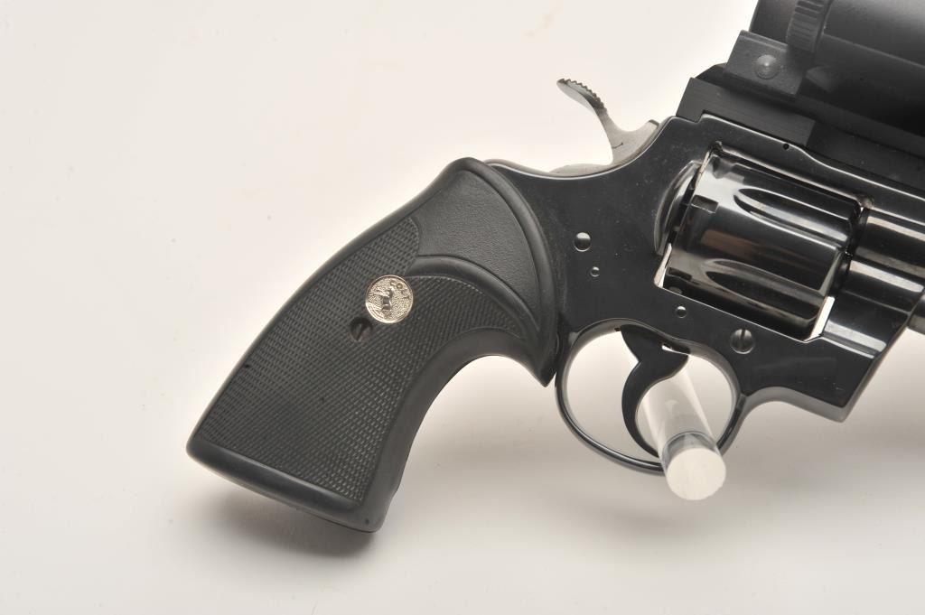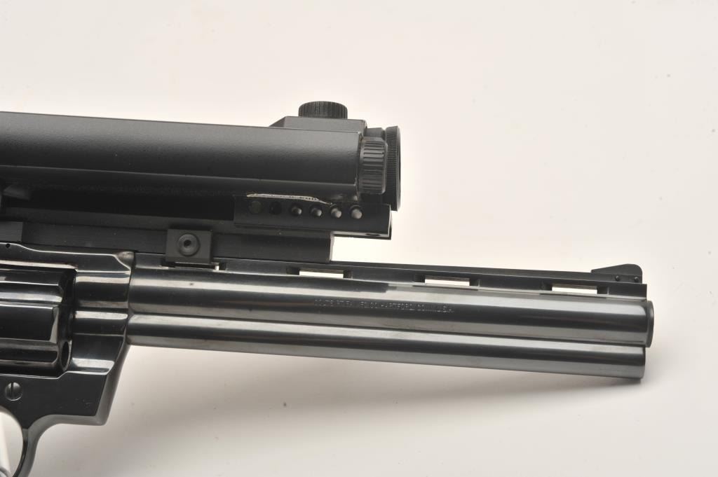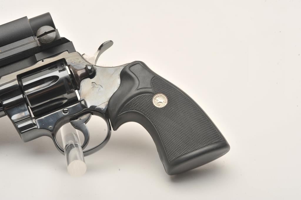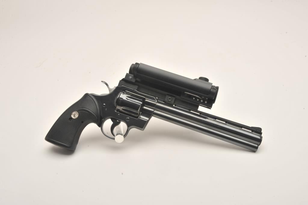 Early Colt Python, #57224, .357 Mag., 8" barrel, Pachmayr Colt logo grips, rear sights removed and Aimpoint Mark III red dot sight added. Revolver is in near excellent condition, retaining approximately 95-98%original finish with just a slight drag line. Bore is excellent, action is excellent. Mfg 1966. (C&R, PPT) Est. $1500-3000