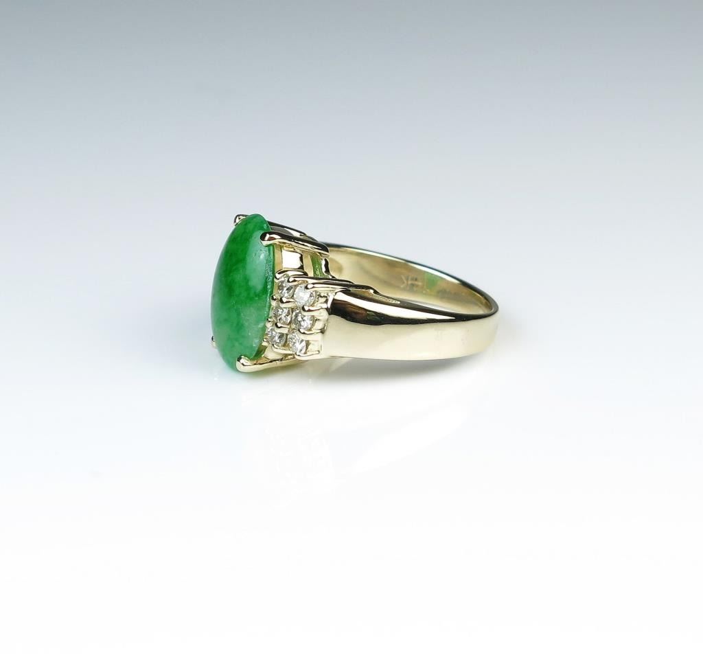 Lovely Apple Green Jade and Diamond ring with oval Jade weighing 3.62 carats accented with 2 sides with 12 round cut Diamonds weighing approx. 0.40 carats with G-H colors and VS/SI clarity set in 14 karat yellow gold. Retail $2,500-$3,000 Estimates $1,500-$2,000