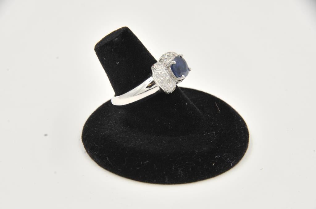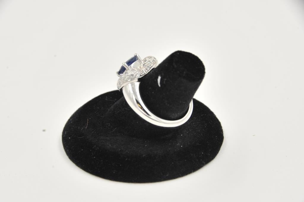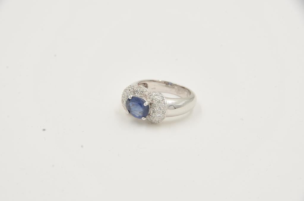 One beautifully designed 18k white gold ring set with a high quality oval sapphire weighing approx 2.5ct and with fine quality diamond paved on each side Est$2000-2500
