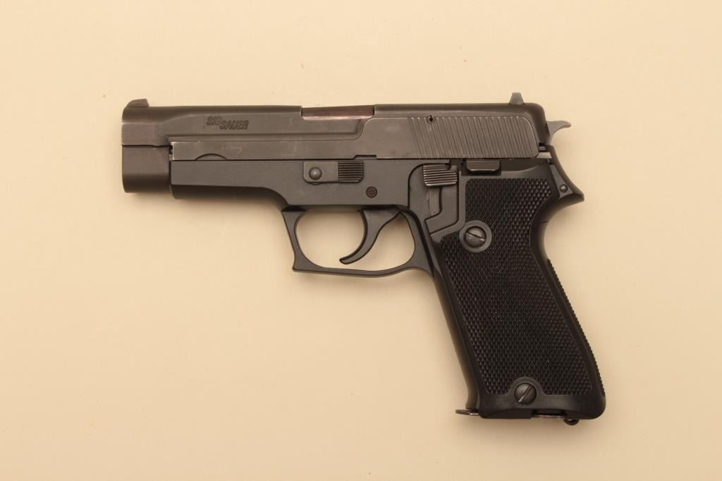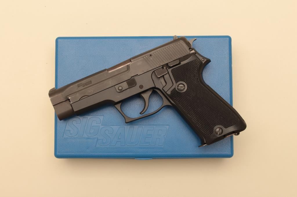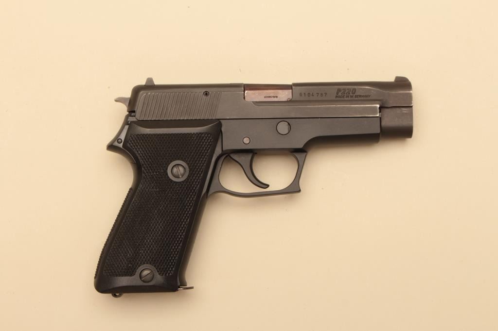 Early Sig Sauer P220 #G104787, 9mm, 4 1/4" barrel, matte finish, fixed sights, European mag release, lanyard loop, checkered plastic grips. Pistol is in fine to excellent condition overall. Excellent grips, verygood bore. The P220 is unusual in 9mm and this is an early example. Includes Hawes cardboard box (importer of the early Sigs), manual and one correct mag. (Modern/PPT) Est. $350-700