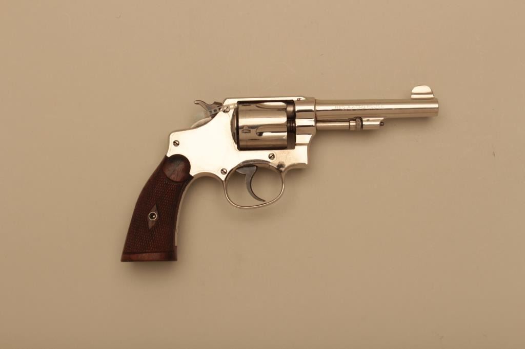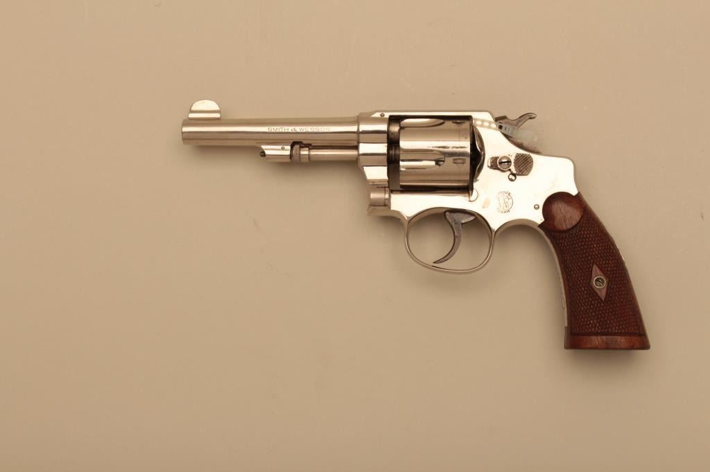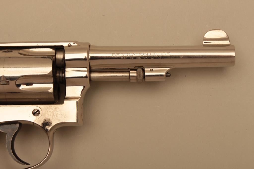 Smith & Wesson Hand Ejector Regulation Police 5 screw DA revolver, .38 S&W caliber, 4” barrel, nickel finish, checkered wood grips, S/N 19180; overall fine to excellent condition with a fine bore, crisp action,sharp markings and fine grips. (C&R). Est.: $400-$800.