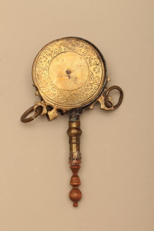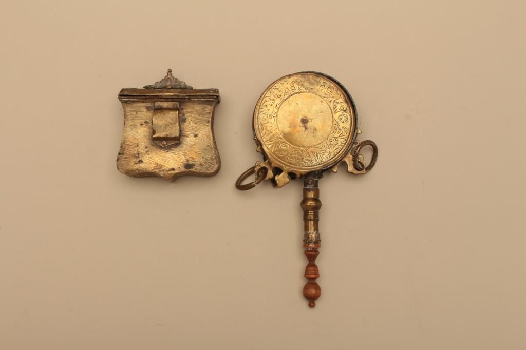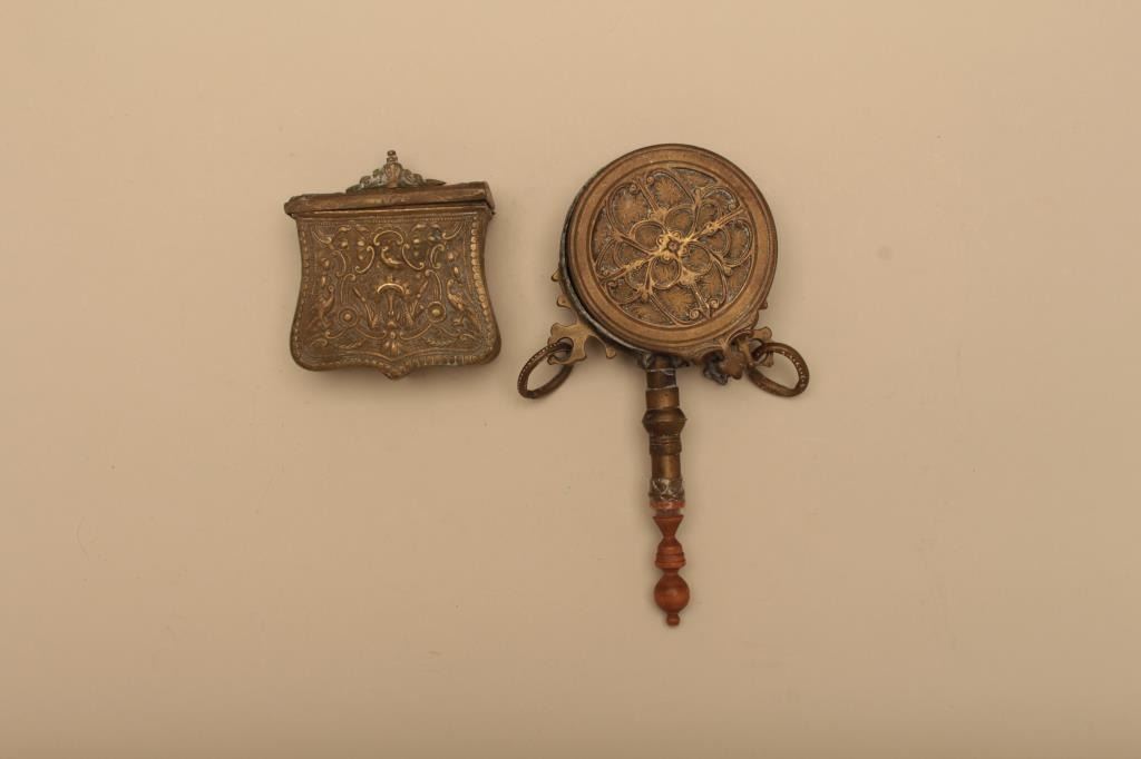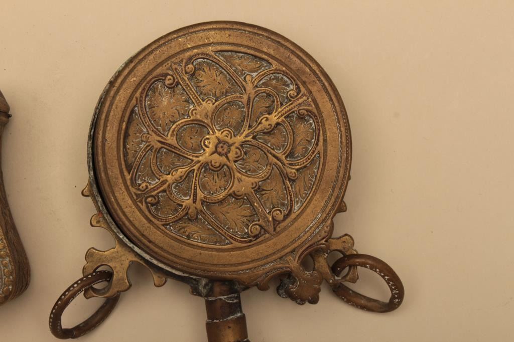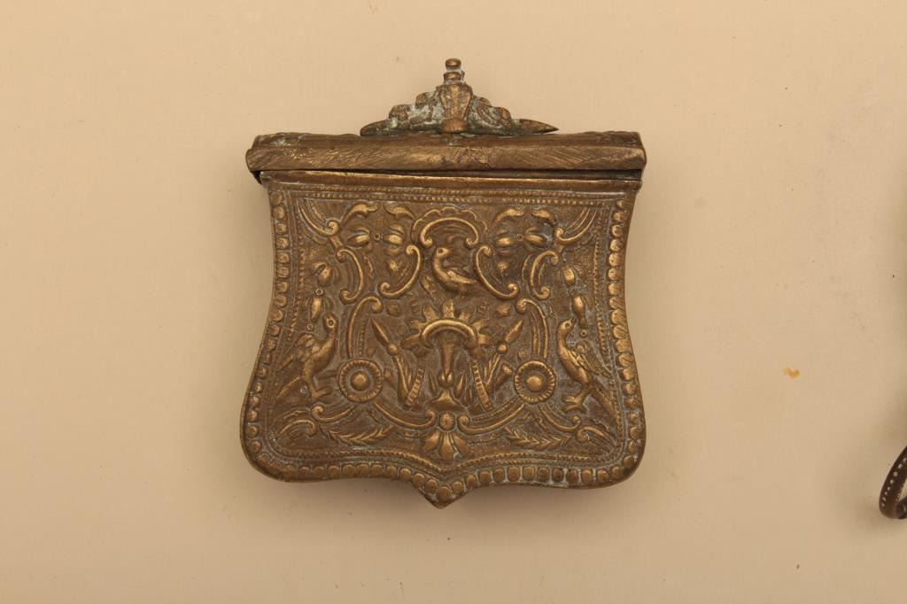 Lot of brass cartridge holder and flask. Both items are done in cast relief brass which has taken on a pleasing patina. The cartridge box has a small repair on top. The wooden handle on the flask is held withtape. Est.: $25-$50.