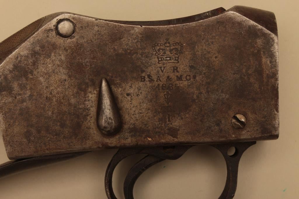 Martini Henry receiver marked BSA & Co. and dated 1885. The action appears to be functional and includes the trigger assembly. The metal surfaces have taken on a grey/brown patina with numerous British proof marks including the arrow and crown markings. A nice action for building a Martini rifle. Est.: $150-$300. (Antique).