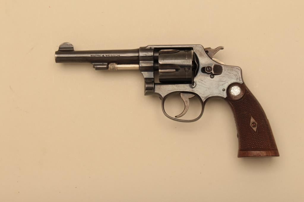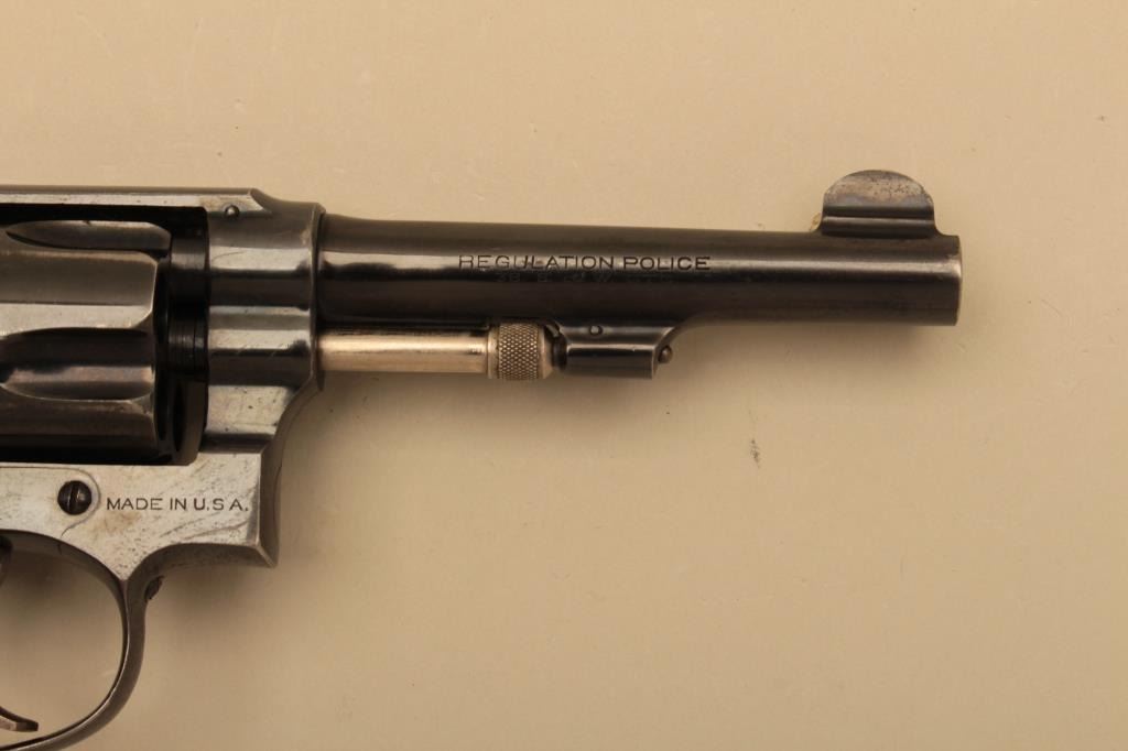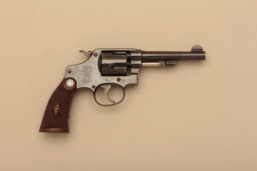 Smith & Wesson Hand Ejector Regulation Police DA revolver, .38 S&W caliber, 4” barrel, blued finish, checkered wood medallion grips, S/N 52451; overall fine to excellent condition with majority of original finish,fine bore, action, markings and grips. (C&R). Est.: $250-$500.