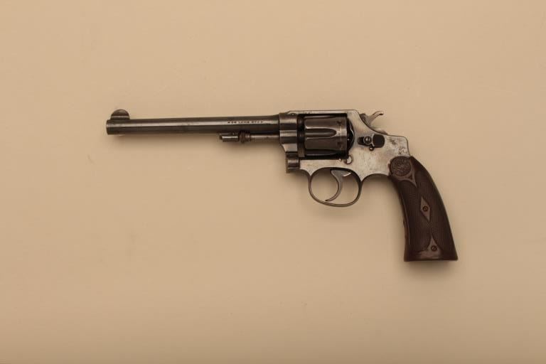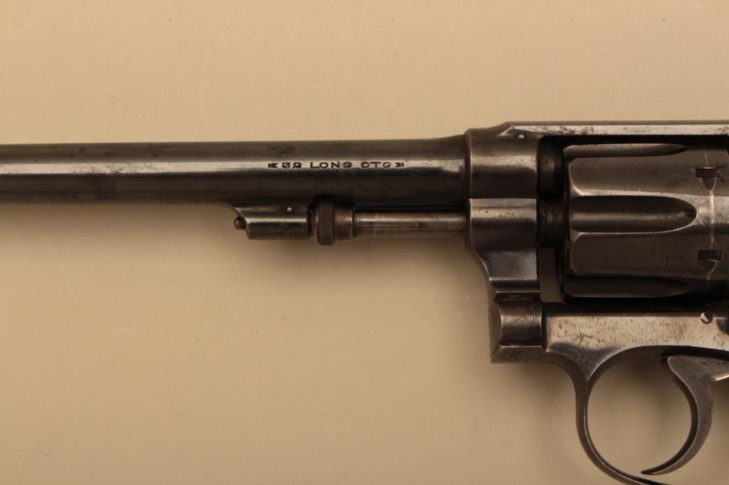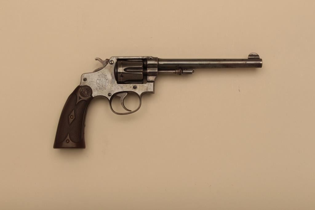 Smith & Wesson hand ejector DA revolver, .32 Long caliber, 6ā€ barrel, blued finish, checkered hard rubber grips, S/N 13480; overall very good to near fine condition displaying majority of original finish; nearfine bore, crisp action and markings, extended grips show old ā€œVā€ loss at top rear of grips. (C&R). Est.: $600-$1,200.