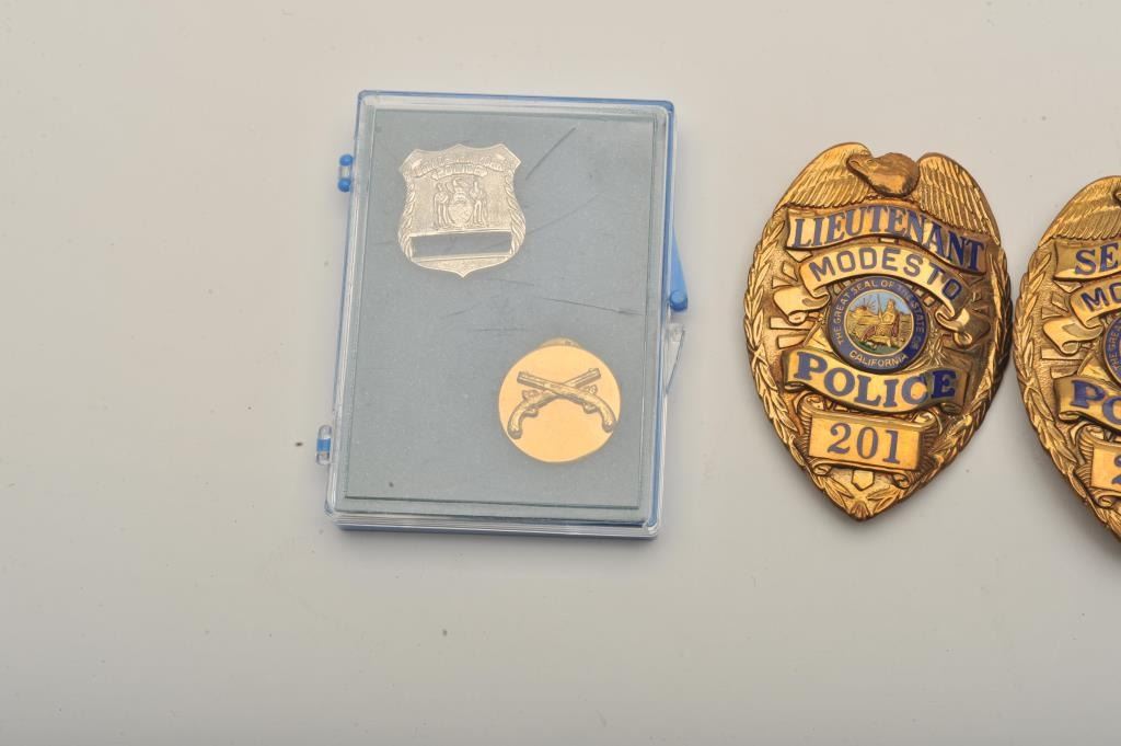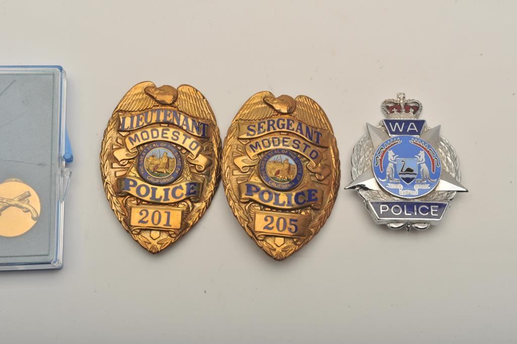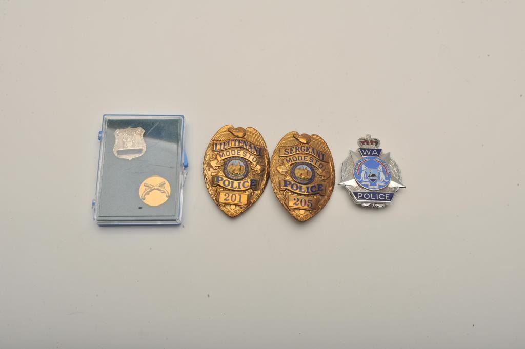 Lot of 4 badges including an Australian Police badge marked “WA/Police” with hallmark “SHERIDAN/PERTH”, a Modesto Police Lieutenant pin shield badge (#201/hallmark Entenmann-Rovin Co.), a Modesto PoliceSergeant pin shield badge (#205/hallmark Entenmann-Rovin Co.) and a small City of New York Police shirt pin shield with crossed pistol small pin badge. Est.: $150-$300.