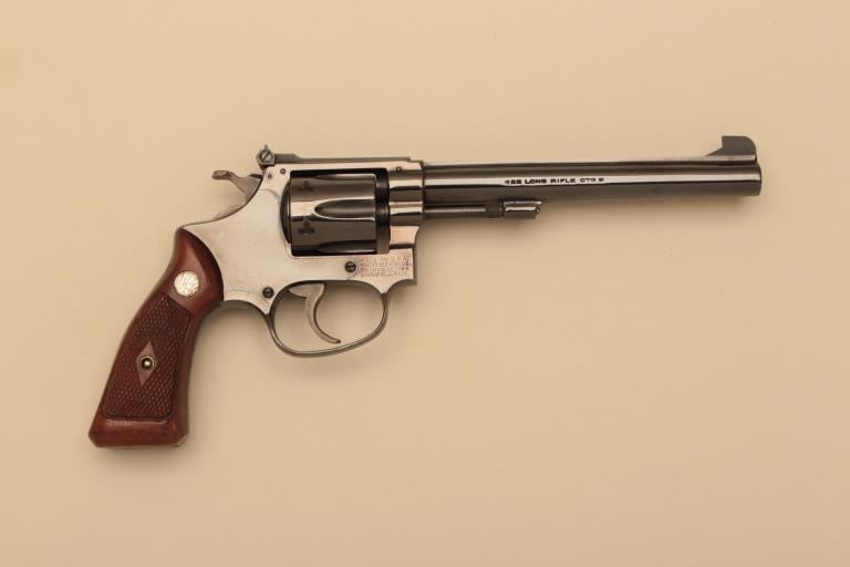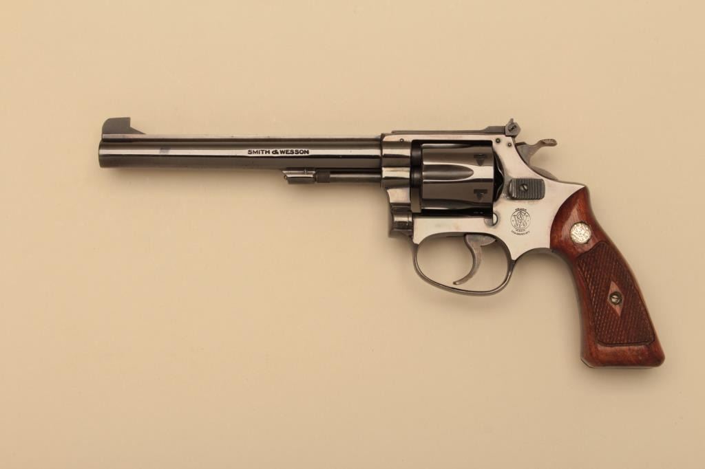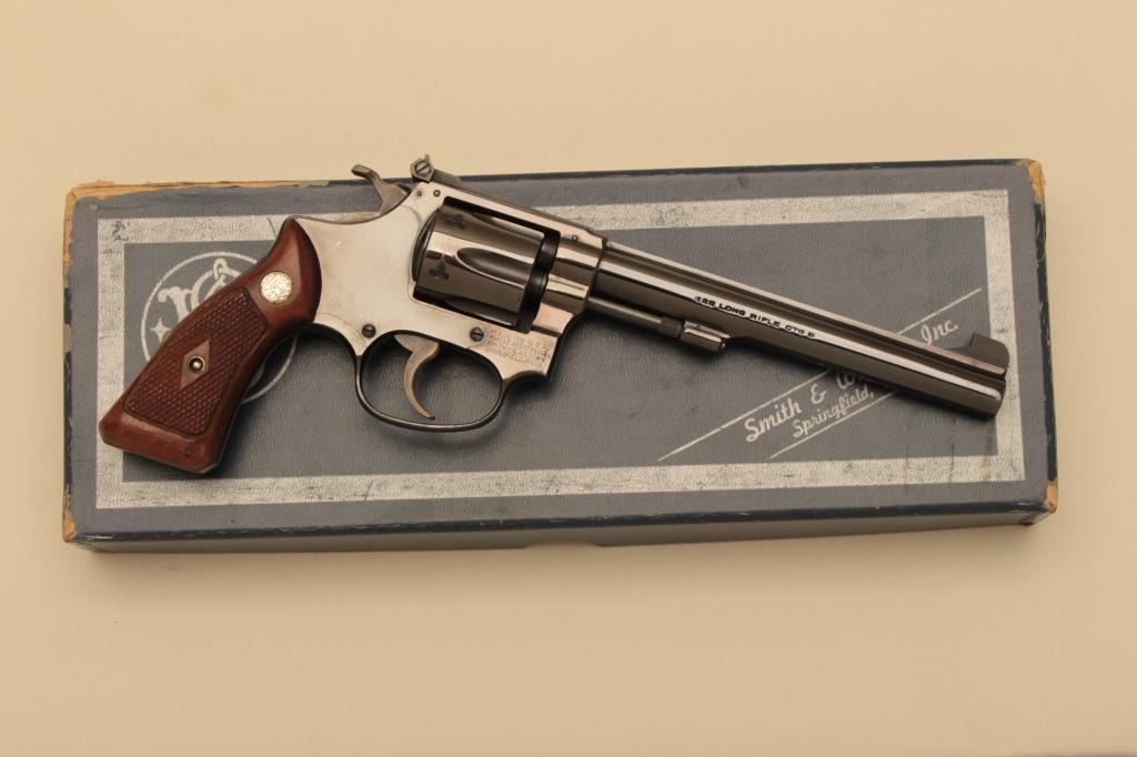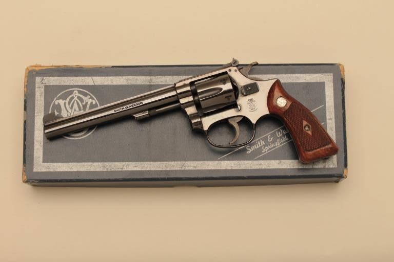 Smith & Wesson Model 35 DA revolver, .22LR caliber, 6” barrel, blued finish, flat latch, checkered wood medallion grips, S/N 61363; in like new condition with factory two piece cardboard box. (C&R). Est.:$500-$1,000.