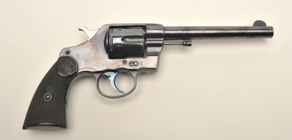 Colt U.S.N. marked DA revolver, .38 caliber, 6” barrel, high polish blued finish, checkered black hard rubber grips, S/N 16908 (additional number 227284 on back of butt strap has been X’ed out). This gun isinoverall very good + condition showing the majority of its high polish blued finish; interestingly enough, the butt strap shows the naval anchor and the inspector marks “J.L.S.”; also there is a “VT” insidea5-point star on the back of the cylinder, inside the crane and on the cylinder release; further, there is also an “S” inside a triangle on the butt strap. The markings are crisp, the bore very good, the actionverygood and the grips good with some minor old mars and old edge dings on the bottom of the right grip; should be further researched. (C&R/PPT). Est.: $1,250-$2,500.