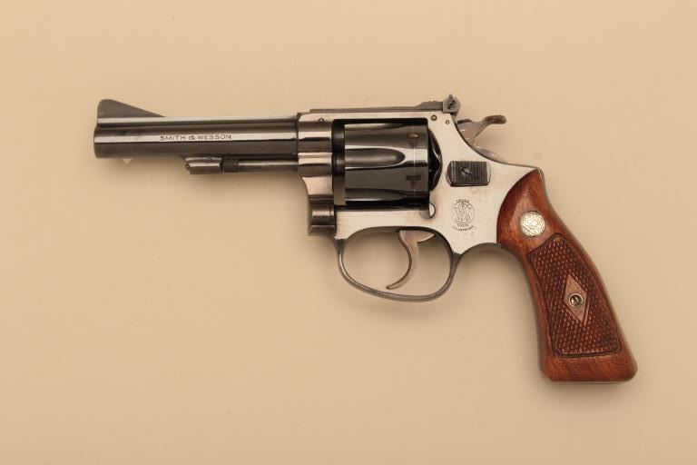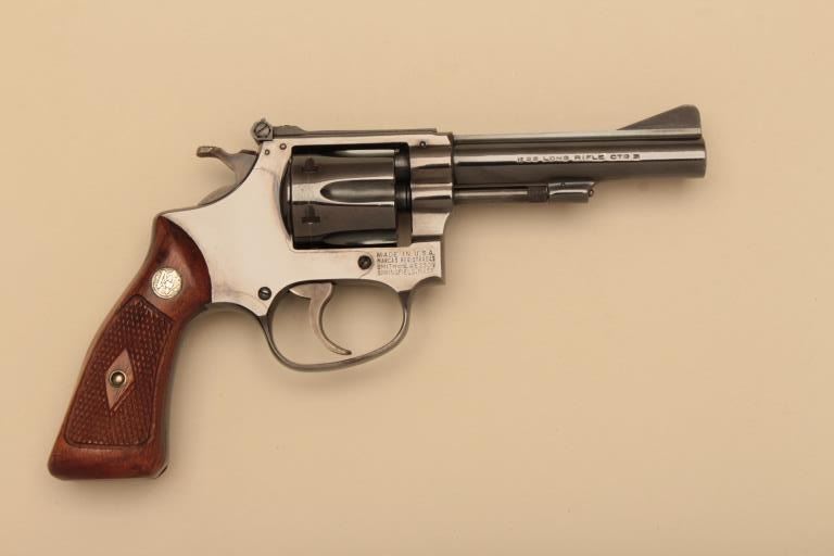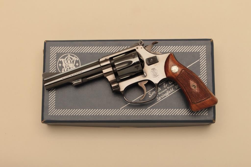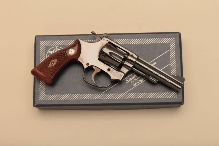 Smith & Wesson Model 34 DA revolver, adjustable rear sight, .22LR caliber, 4” barrel, blued finish, checkered wood medallion grips, S/N 53671; overall near new condition and accompanied by a two piecefactory cardboard box with instructions and matching end label. (C&R). Est.: $500-$1,000.