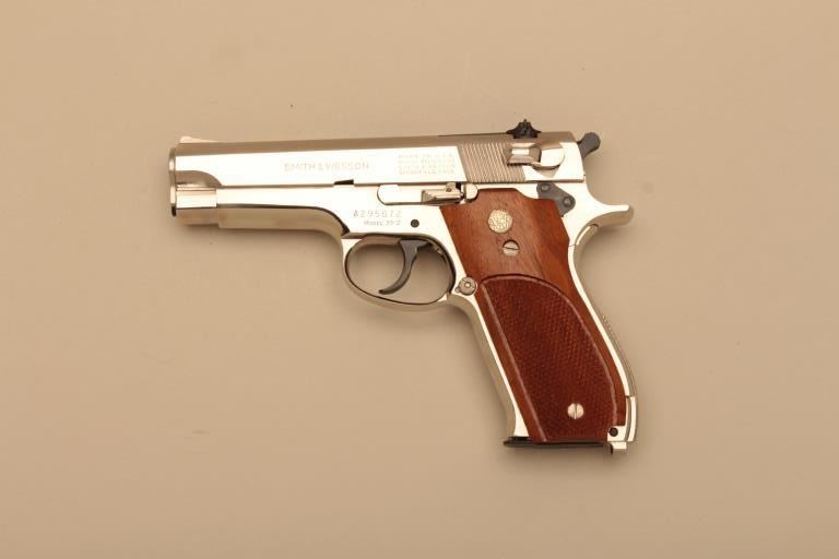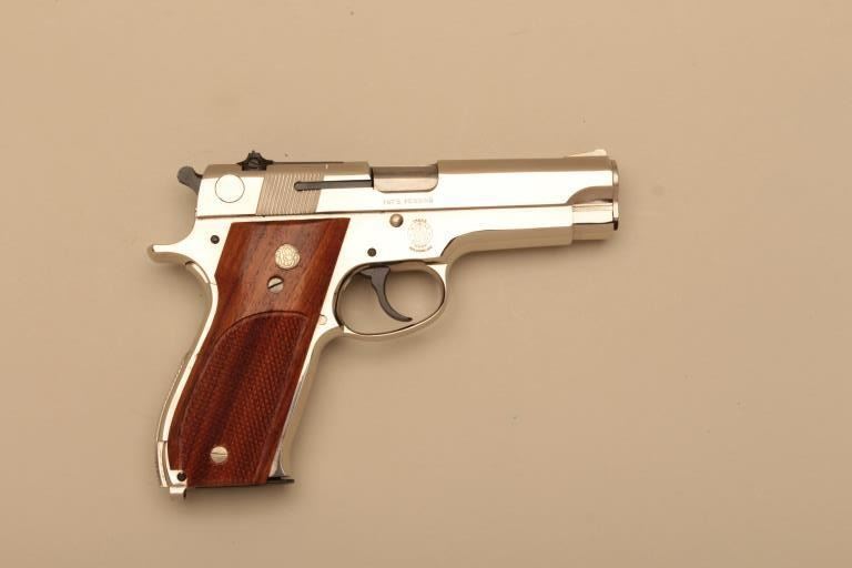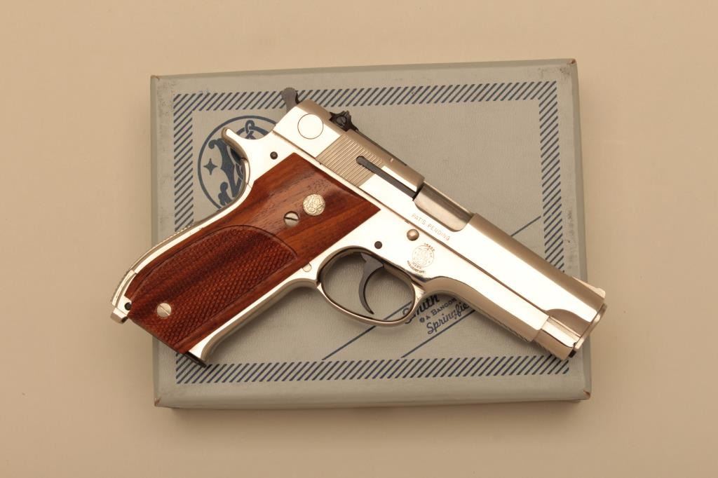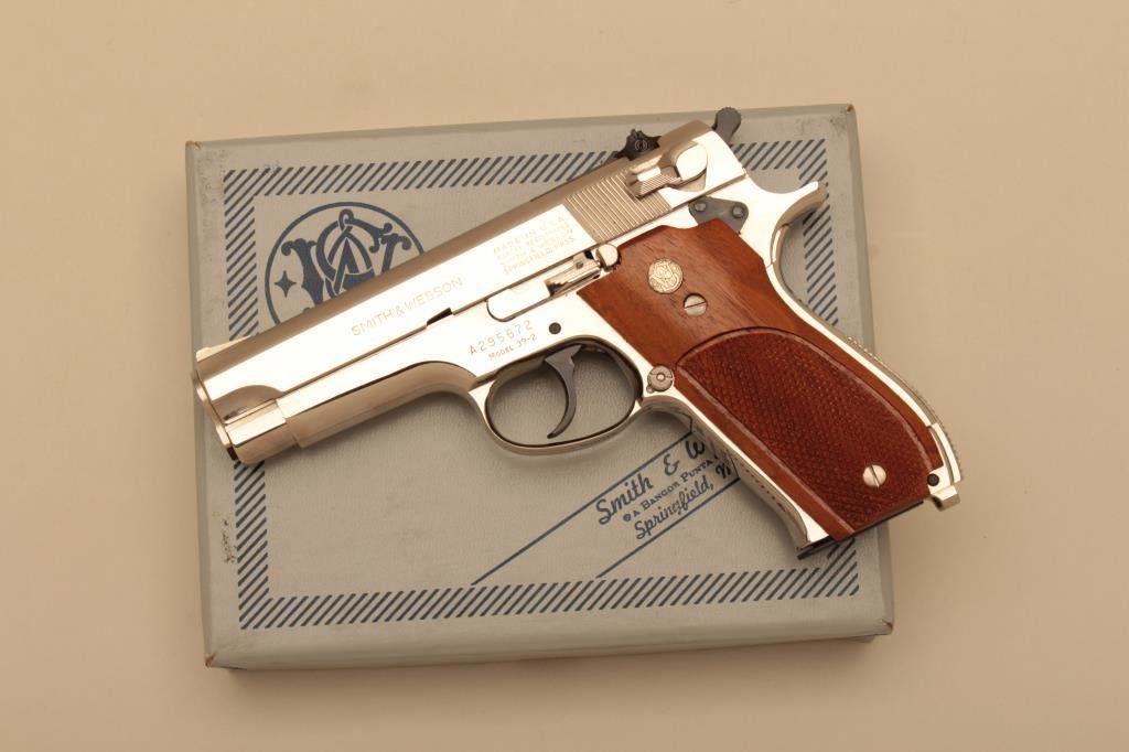 Smith & Wesson Model 39-2 semi-automatic pistol, 9mm caliber, 4” barrel, nickel finish, checkered wood medallion grips, one extra magazine, instructions sheet, cleaning tool, S/N A295672; in like new condition with factory silver and blue two piece cardboard box and end label numbered to this gun. (Modern/NO CAL. SALE). Est.: $400-$800.