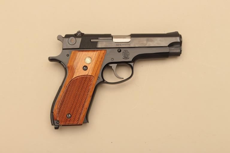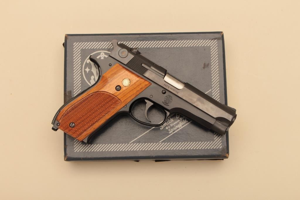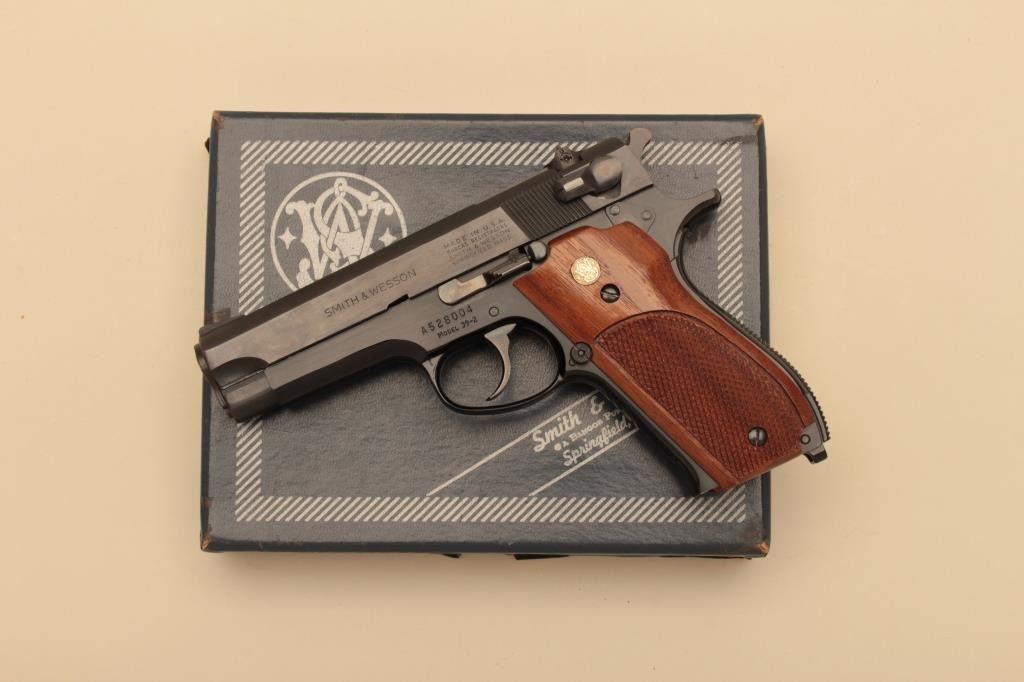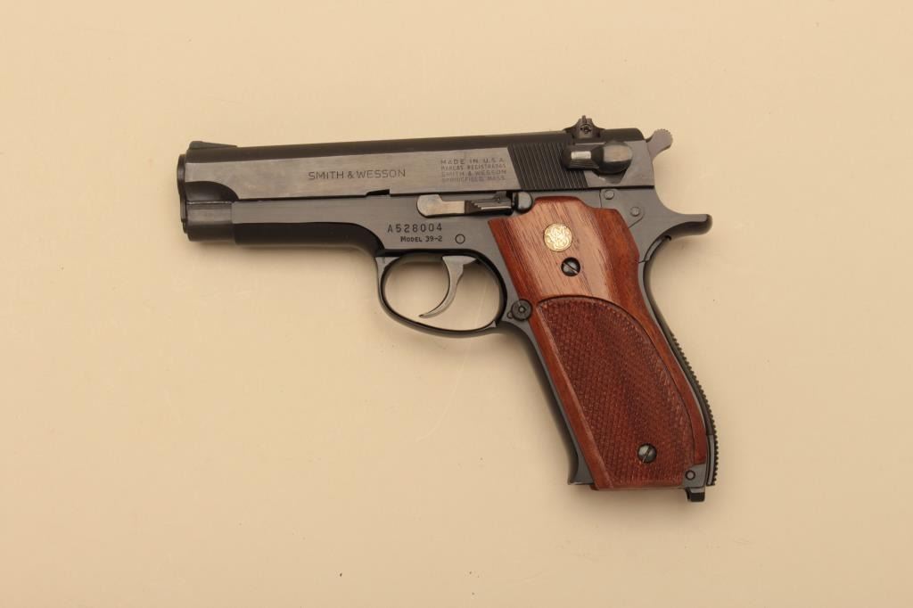 Smith & Wesson Model 39-2, #A528004, 9mm, 4" barrel, blued finish, adjustable sights, checkered medallion walnut grips. Pistol is in near excellent condition overall, showing 98% original finish. Very good bore,excellent action, grips are near fine with no chips or cracks. One grip screw is buggered up. Minor handling marks. Includes original box and one mag. (Modern/PPT) Est. $350-700