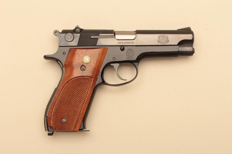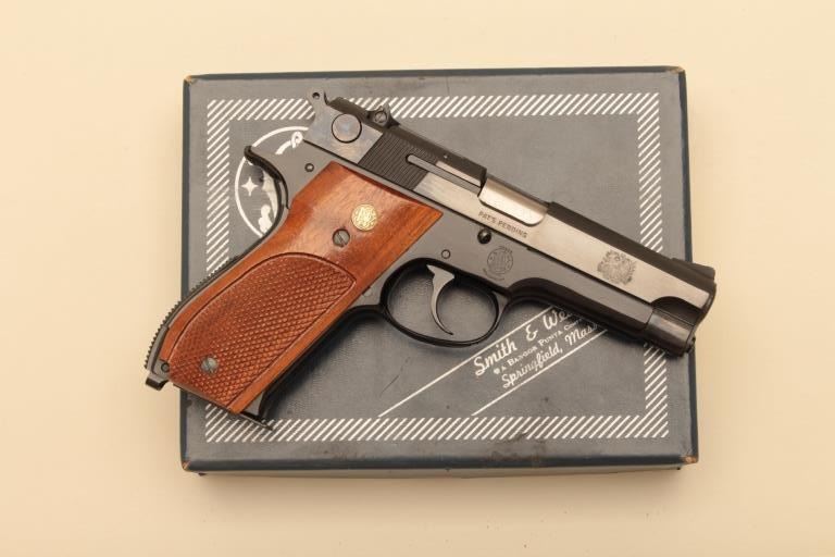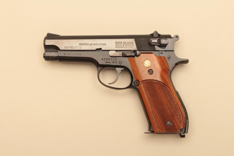 Smith & Wesson Model 39-2 Venezuelan contract, #A168528, 9mm, 4" barrel, blued finish, adjustable with checkered medallion wood grips. Pistol is in fine condition, retaining 95%+ original finish, great boreand excellent action. Venezuelan crest on right side of slide and '02-72/PTJ' on front left side of slide and frame. Includes original two piece box, instructions and 2 mags. (Modern/PPT) Est. $350-700