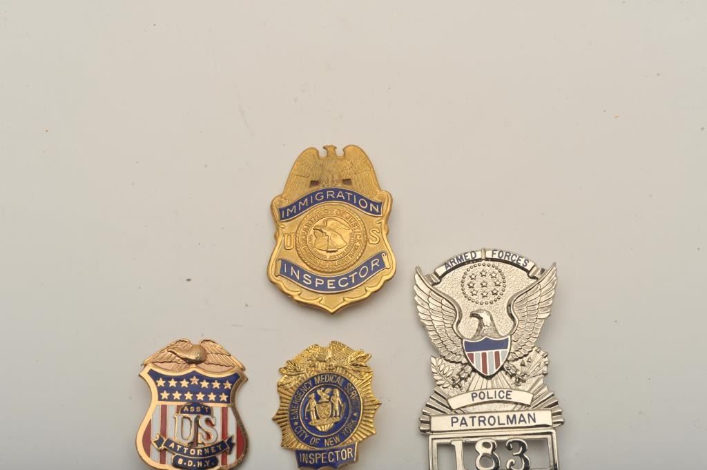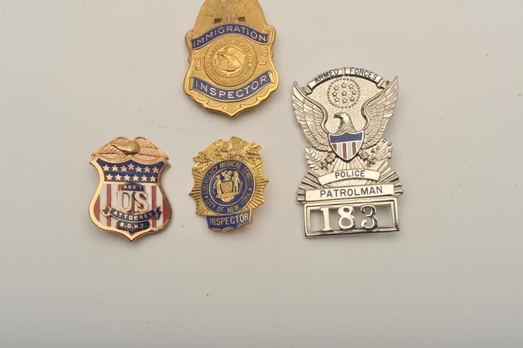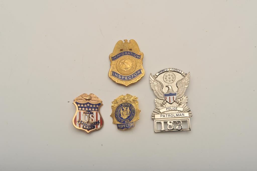 Lot of 4 badges including an Immigration Inspector (U.S.) pin shield badge with raised stamping on back “THIS BADGE CONVEYS NO AUTHORITY UNLESS ACCOMPANIED BY PROPER CREDENTIALS”, a small Ass’t U.S. Attorney,S.D.N.Y. pin shield badge, a small City of New York Emergency Medical Service Inspector pin shield badge and an Armed Forces Police Patrolman pin shield badge (#183/hallmark Blackinton. Est.: $150-$300.