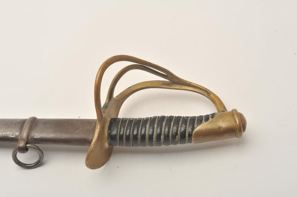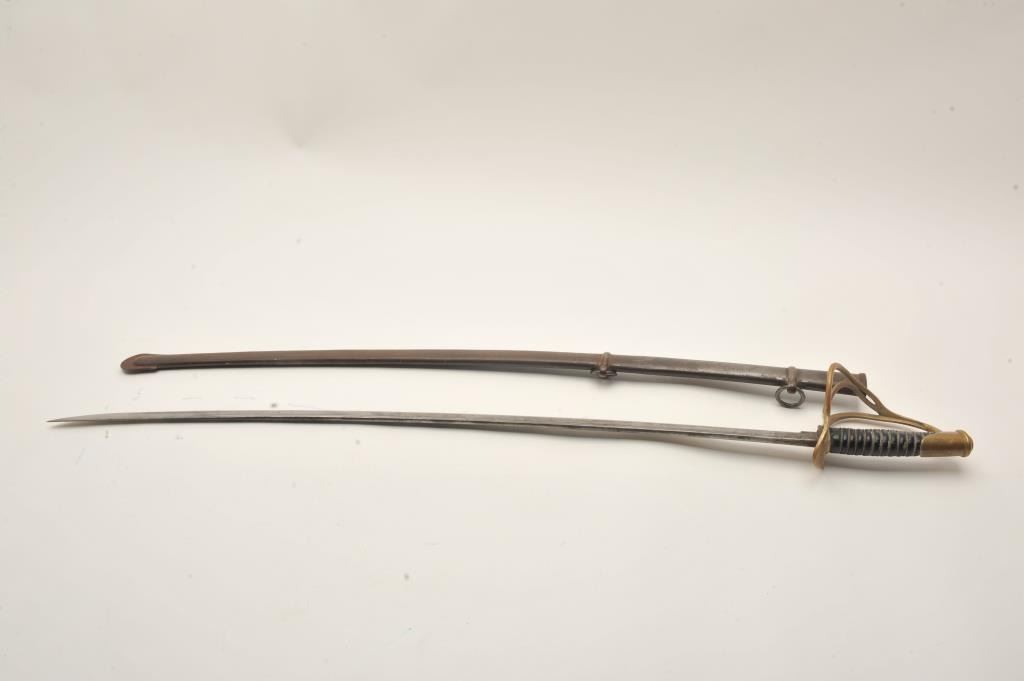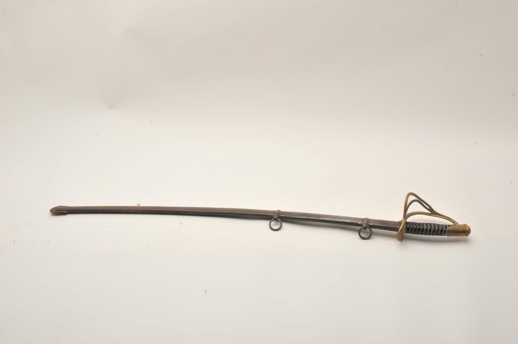 U.S. Model 1860 Cavalry sword and scabbard by C. Roby, blade dated 1865 on the ricasso, brass guard, wire wrapped grip; overall good condition with plain blade; iron scabbard is good overall with dark patina, some scattered surface rust and wear to the drag. Est.: $300-$600.