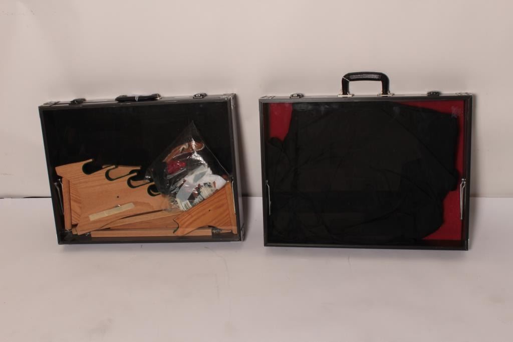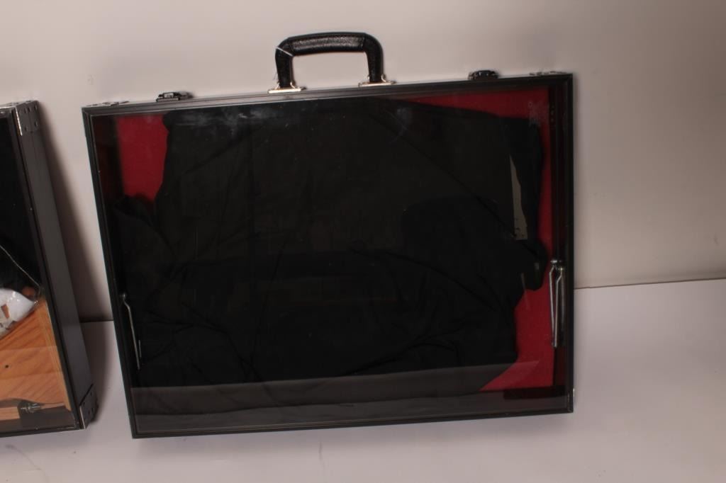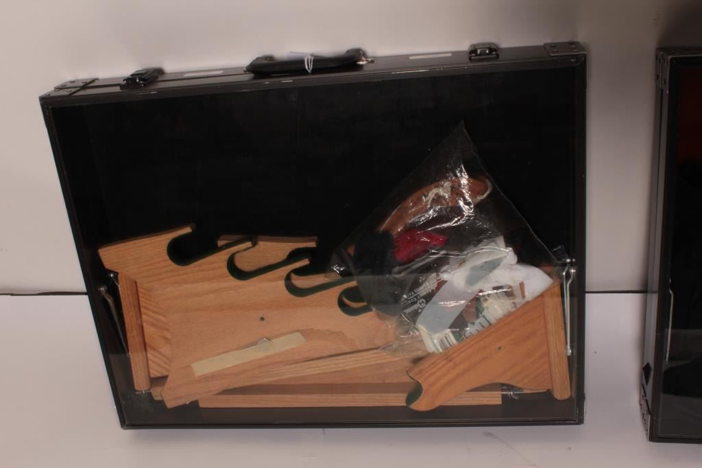 Lot of 2 small display cases for gun or trade shows, approximately 18” x 24” x 4”; high quality; additionally, several wood display stands for long arms plus misc. soft covers for knives. Accompanied by a fabric carrycase. Est.: $100-$200.