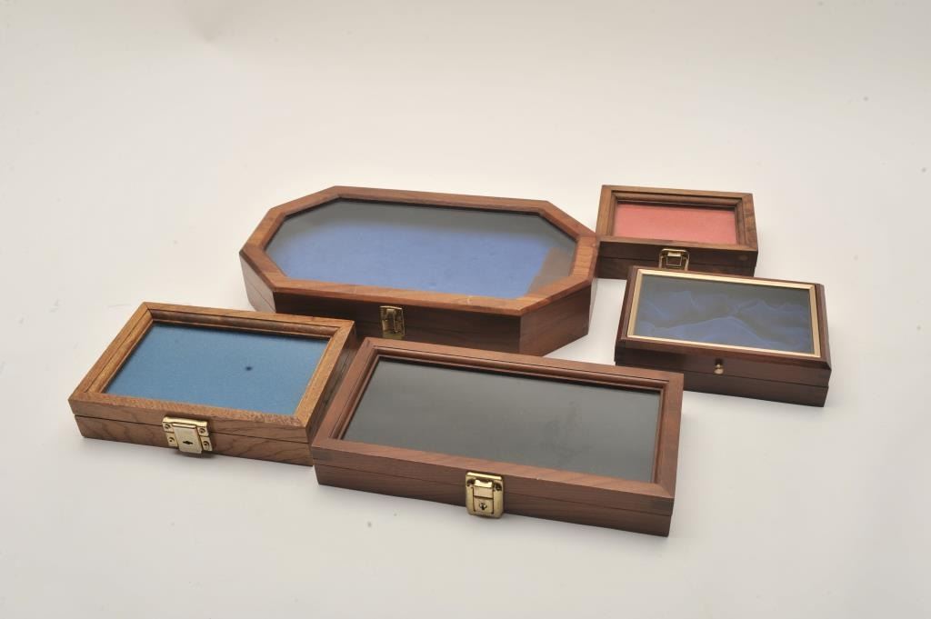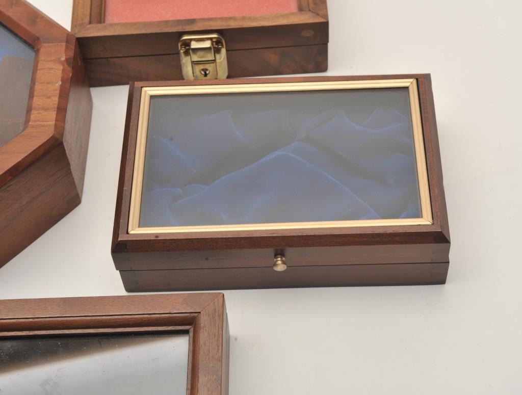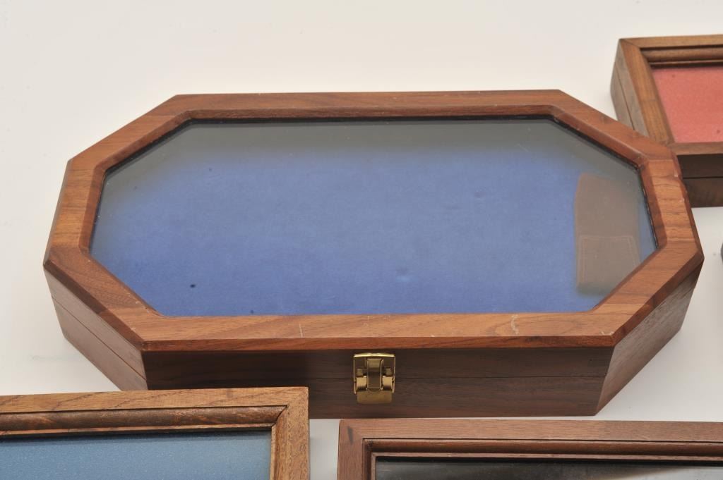 Lot of 5 wood display cases of various sizes from approximately 16” x 8.5” to 7” x 5”. Est.: $50-$100.