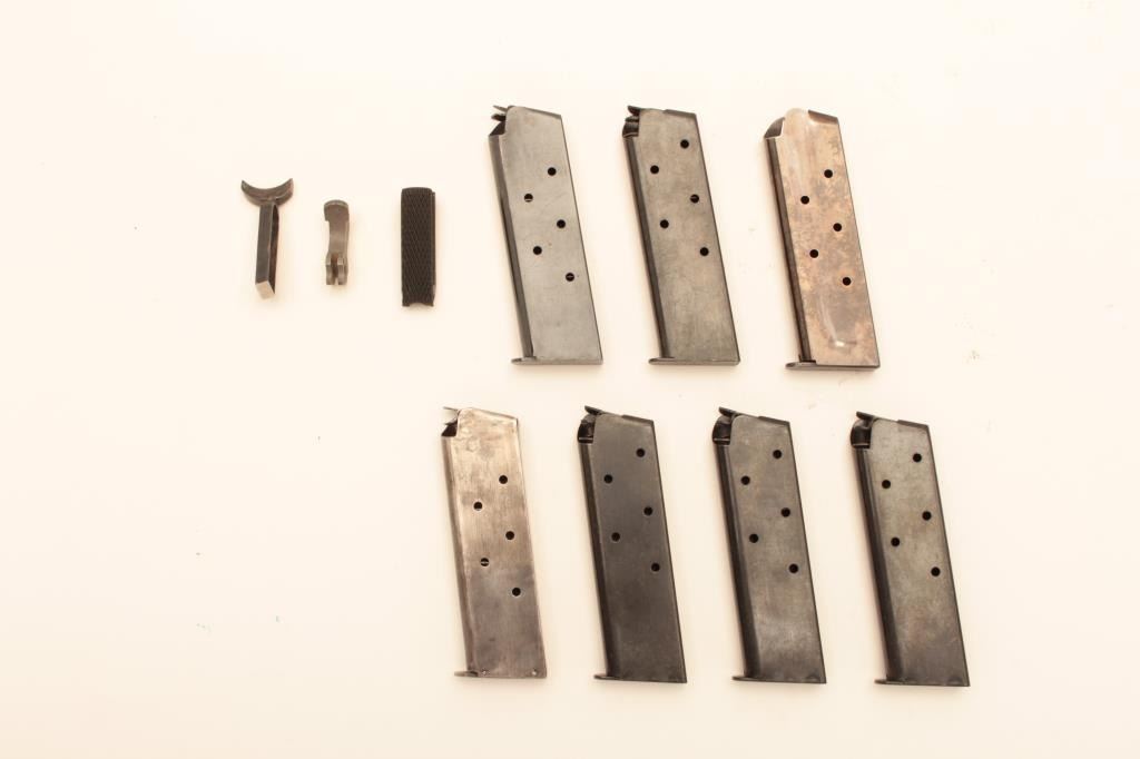 Lot of seven .45 ACP magazines for Colt 1911 pistols. The lot includes seven blued magazines, six of which are marked Colt .45 Auto on the base, the seventh magazine is a two-tone which has faded considerably. Allmagazines are in good overall condition. The lot also includes a bag of assorted small parts for Colt 1911 pistols. Est.: $125-$250.