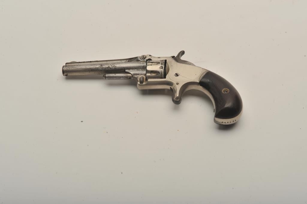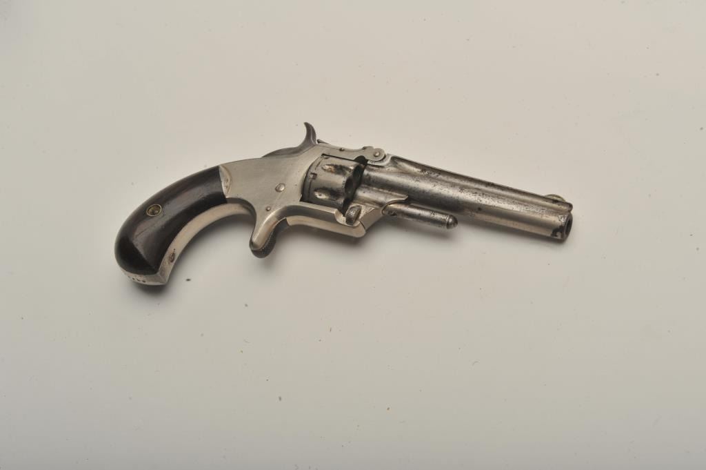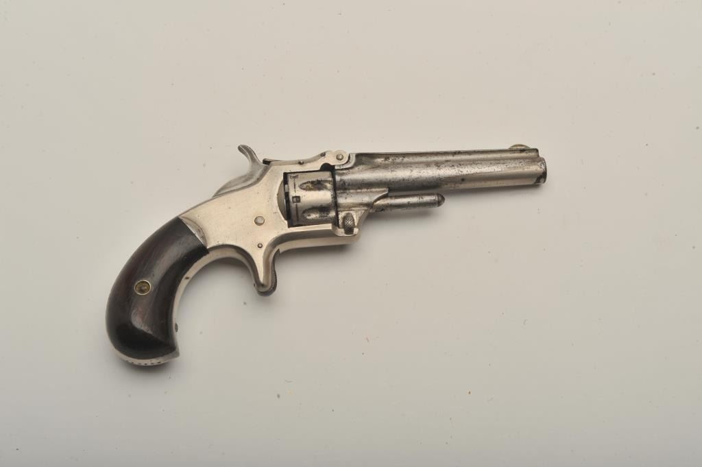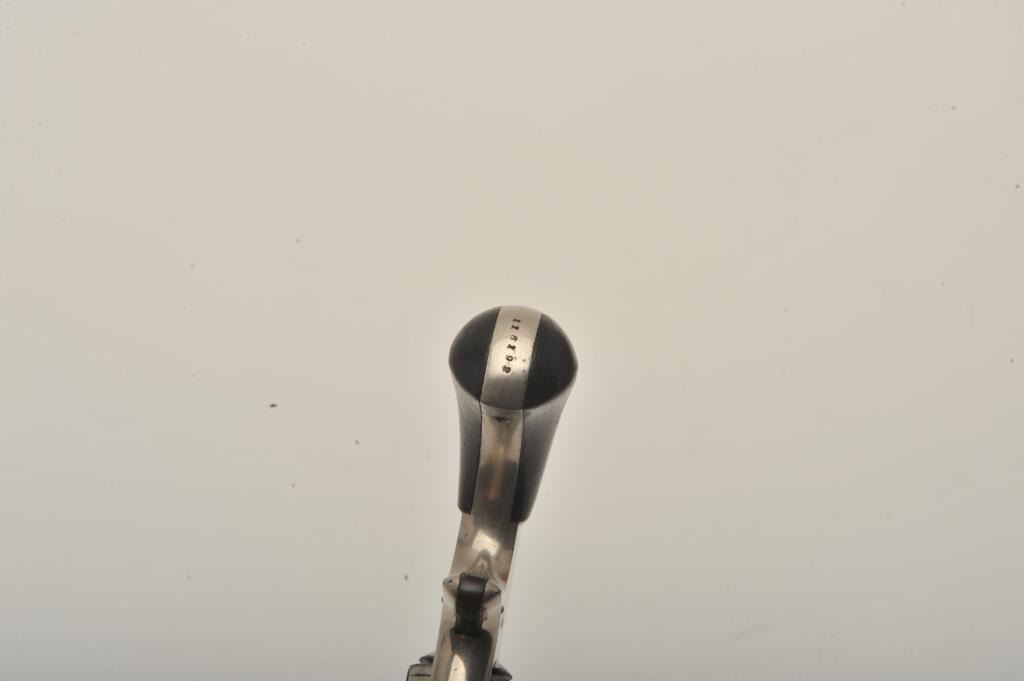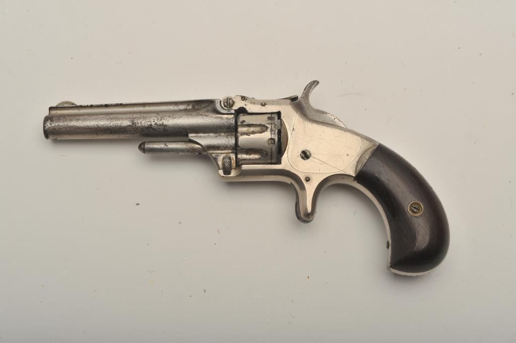 Smith and Wesson Tip Up revolver, .22 caliber, Serial #116192. The pistol is in good overall condition with a 3 ¼” barrel. The pistol retains a significant amount of its nickel finish with areas of light surface rust and erosion primarily on the barrel and an index line on the cylinder. The smooth Rosewood grips are in very good condition with small mars and compressions consistent with carry and use. The bore is good, theaction functions and markings are sharp. Est.: $200-$400. (Antique).