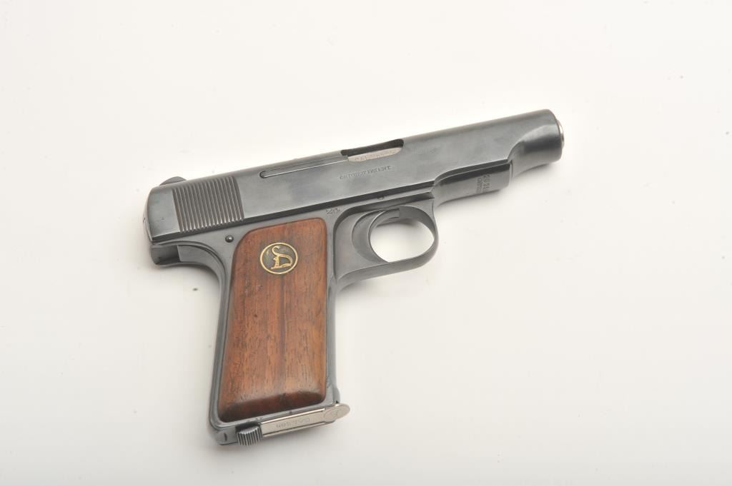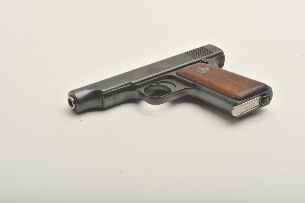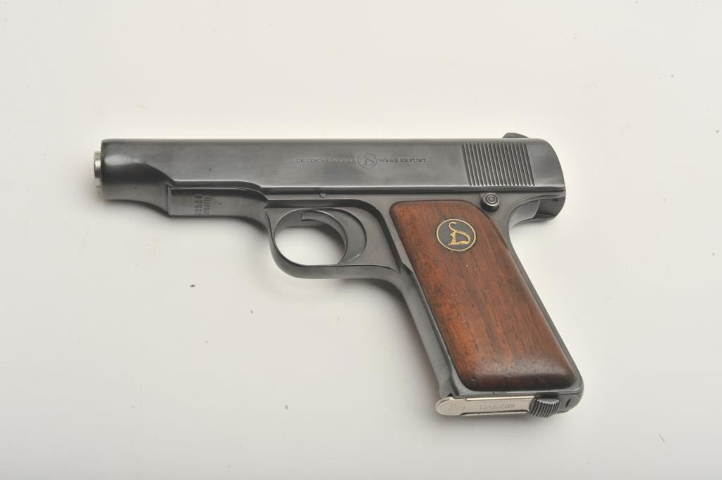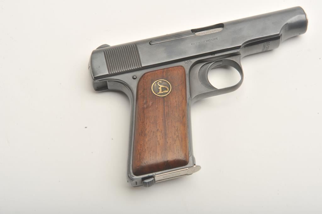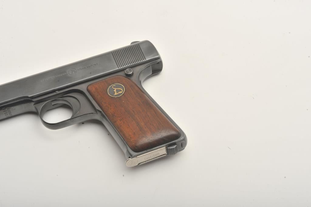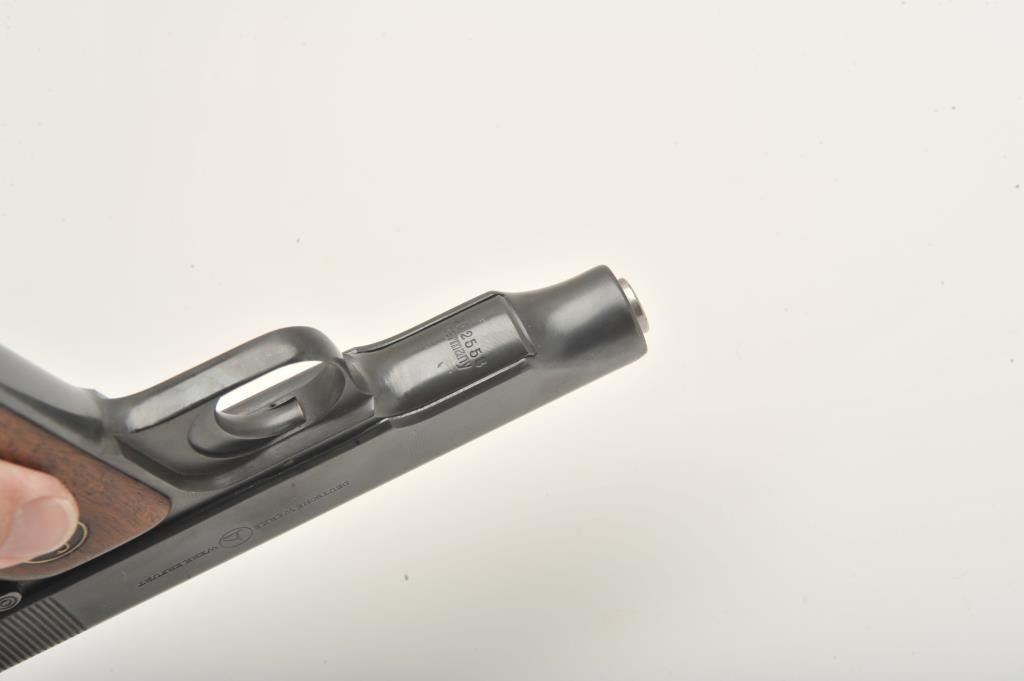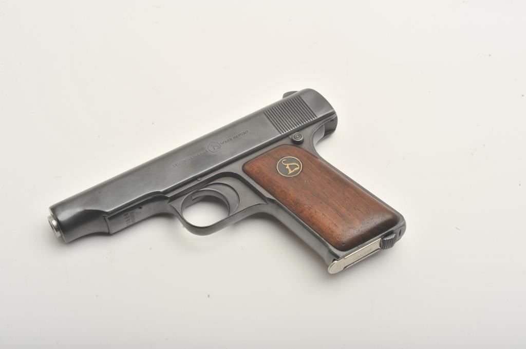 DWM Ortgies Patent semi-automatic pistol, 7.65 mm caliber, Serial #202558. The pistol is in very good overall condition with a 3 ¼” barrel. The metal surfaces retain nearly all of their blue finish with only handlingmarks. The frame is marked, “Germany.” The smooth wood medallion grips are in good condition with small mars and compressions from carry and use. The bore is good, the action is crisp and markings are sharp. Thelot includes one correct magazine. Est.: $300-$600. (Modern).