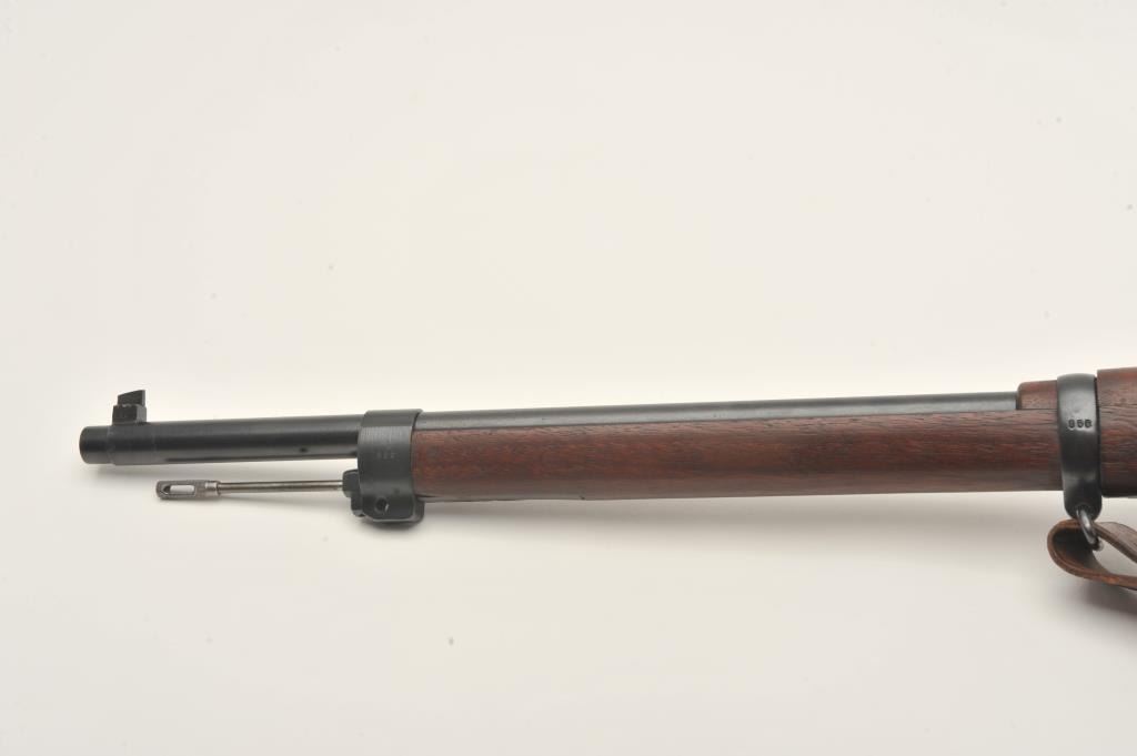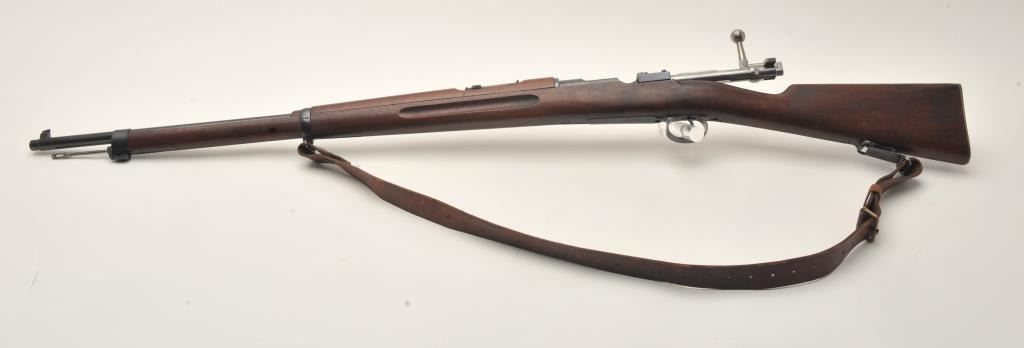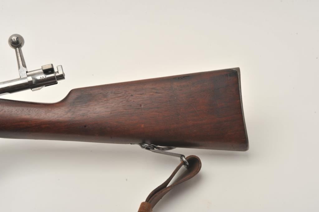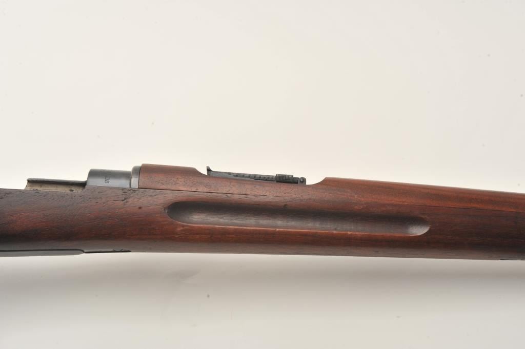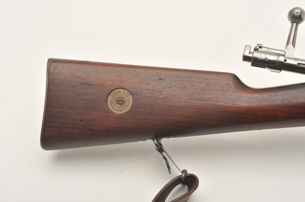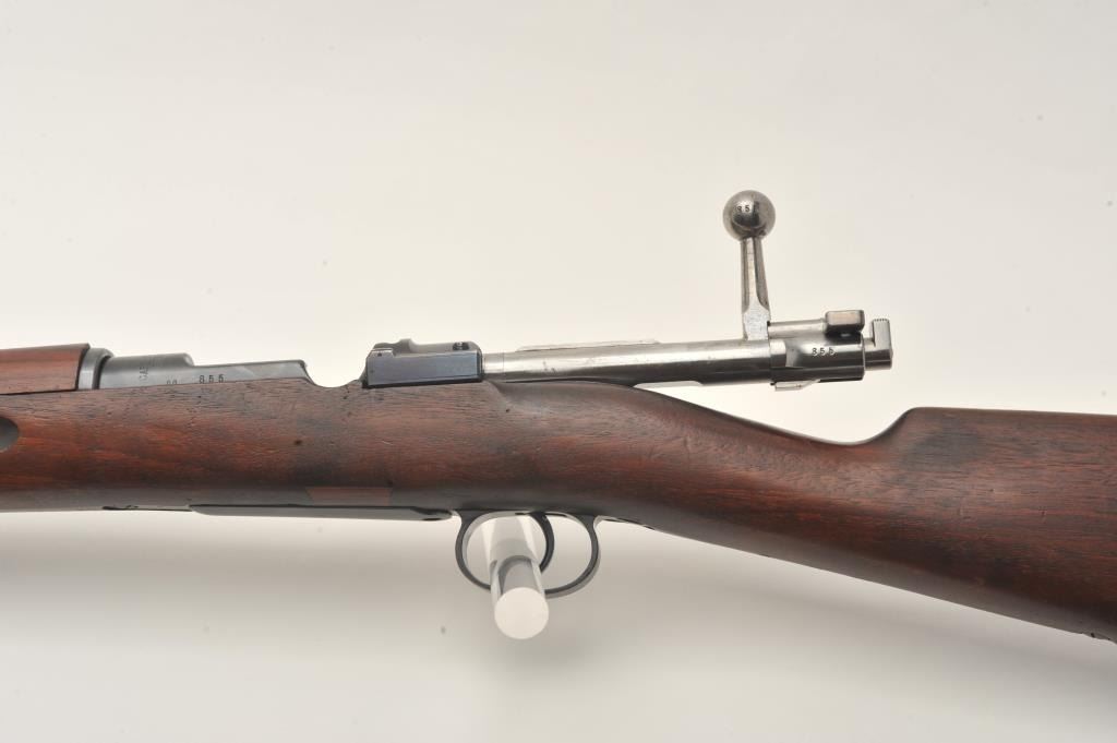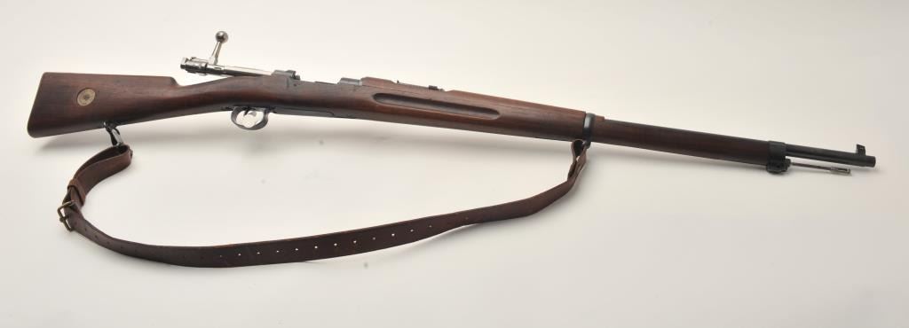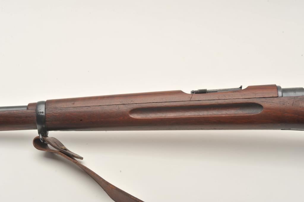 Swedish Carl Gustaf Model 1896 Mauser bolt action rifle, 6.5 x 55mm caliber, 29” barrel, blued finish, wood stocks, no import marks, S/N 855, all matching except rear barrel band which is still arsenal force matched.Overall very good to fine condition with leather sling, fine bore, crisp action and markings, very good to near fine wood. (C&R). Est.: $150-$300.