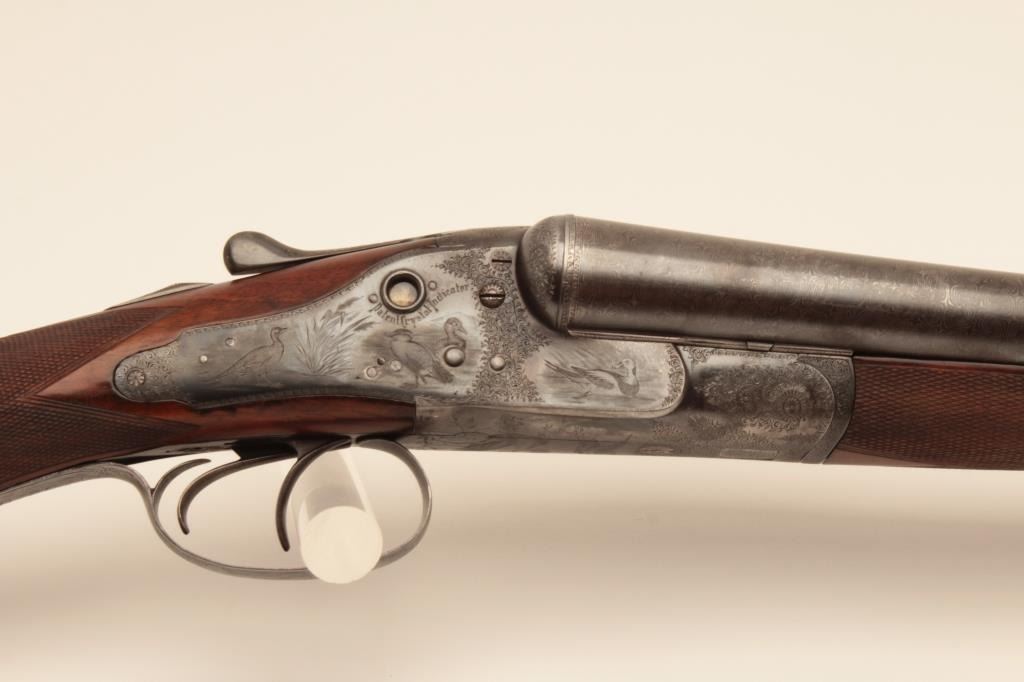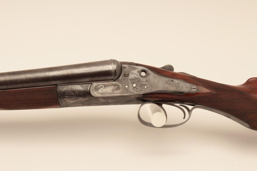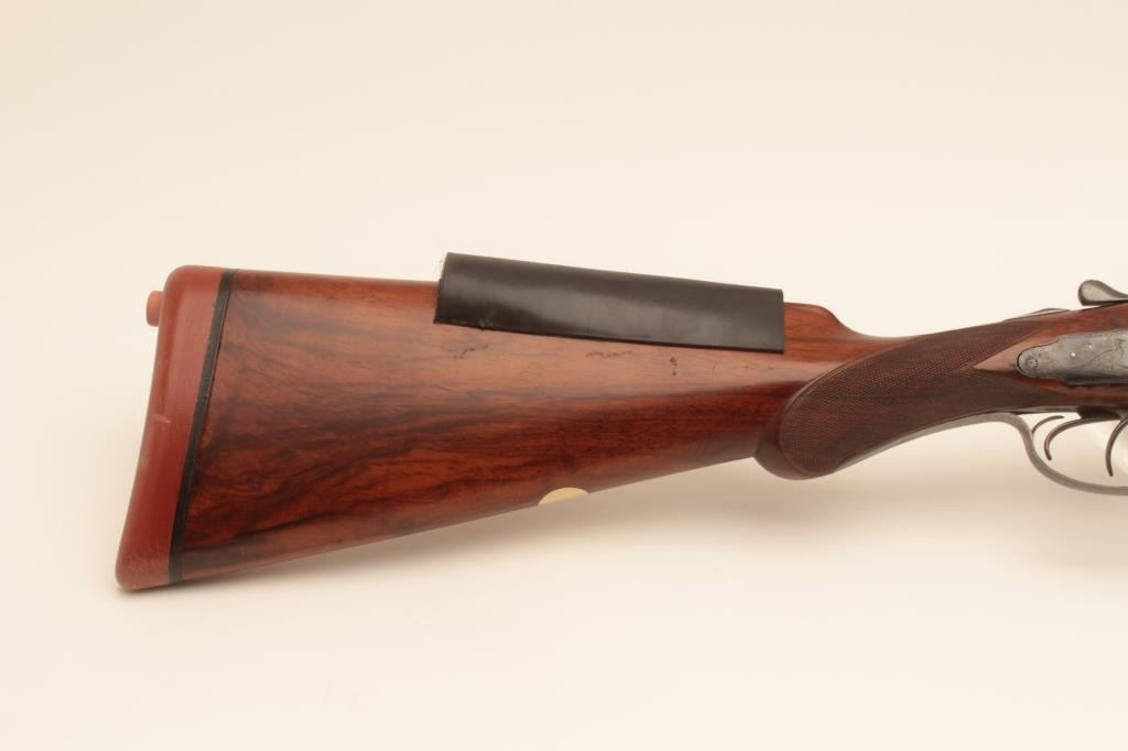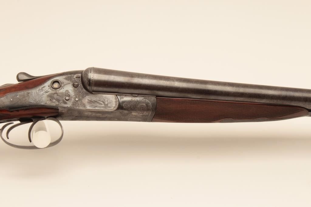 W&C Scott Premier grade 10GA SxS barrel Damascus barrel shotgun, S/N 32100 with 30 ¼” barrel, double triggers and standard extractors. Fine game scene engraving with crystal indicators. Measures 15 ¼” to the end of thick rubber pad with stick on rubber comb riser or extension. Sharp engraving with most pattern showing on barrels, frame and locks appear to have been originally blued with most remaining just slightly dull. Thestocks have been lightly refinished and checkering refreshed. This work is very well done and great wood to metal fit. Hard to find in 10GA. (Antique) Est.: $1750-$3500