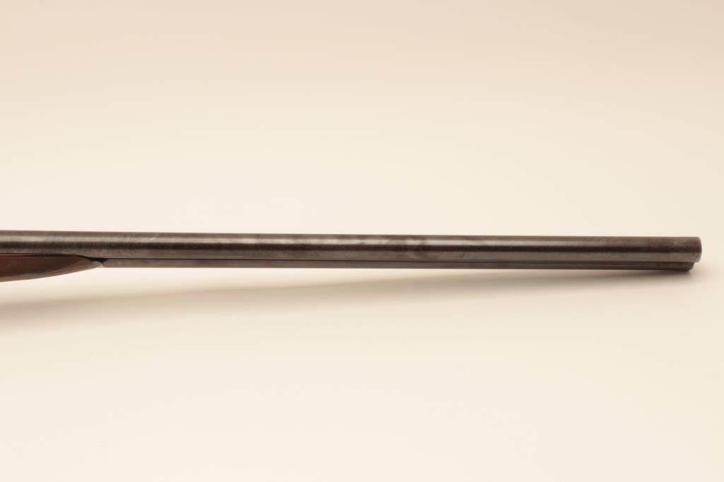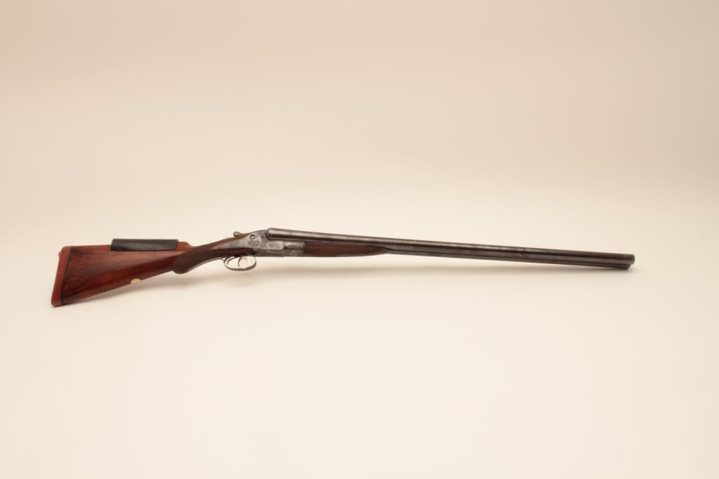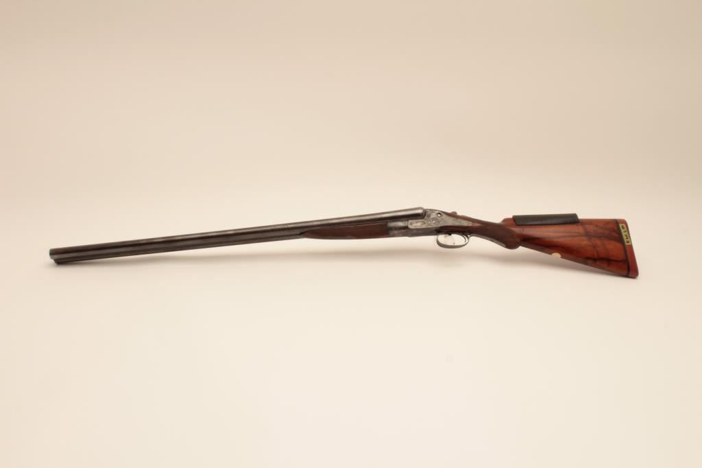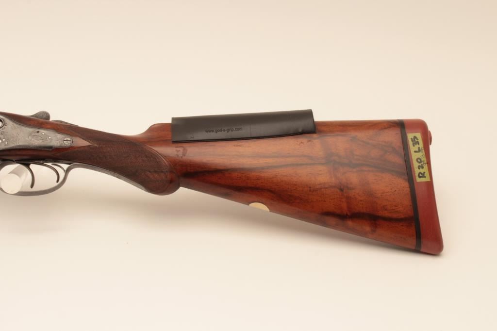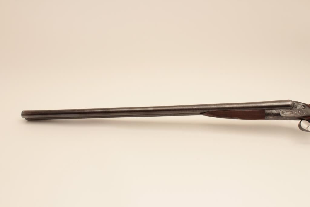 W&C Scott Premier grade 10GA SxS barrel Damascus barrel shotgun, S/N 32100 with 30 ¼” barrel, double triggers and standard extractors. Fine game scene engraving with crystal indicators. Measures 15 ¼” to the end of thick rubber pad with stick on rubber comb riser or extension. Sharp engraving with most pattern showing on barrels, frame and locks appear to have been originally blued with most remaining just slightly dull. Thestocks have been lightly refinished and checkering refreshed. This work is very well done and great wood to metal fit. Hard to find in 10GA. (Antique) Est.: $1750-$3500