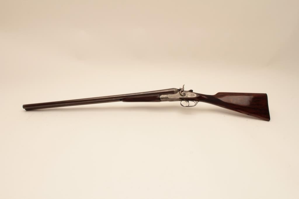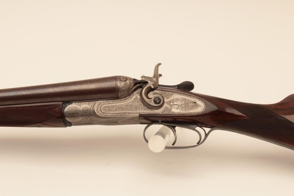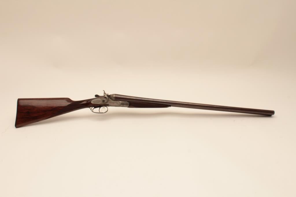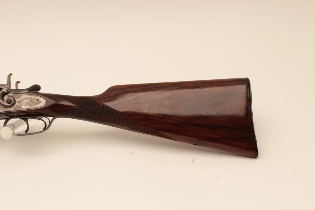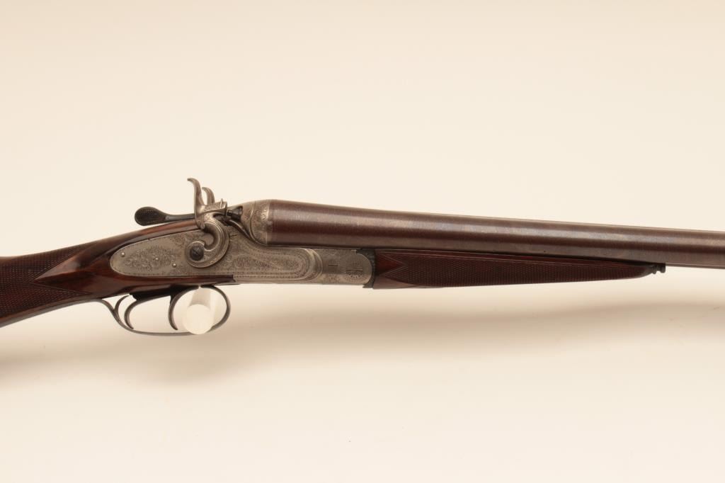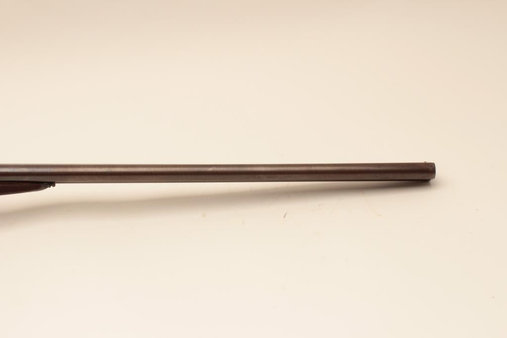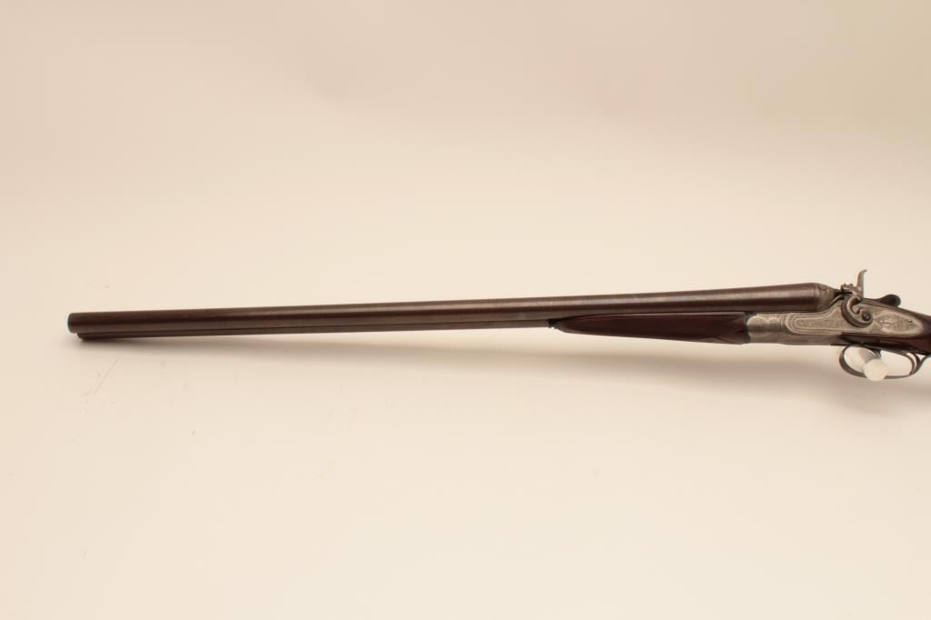 Francotte high grade 12GA exposed hammer Damascus steel barrel antique shotgun with gold inlay on the barrel reading “Damas Arolle Extra Fin-Francotte-Liege”. Satin gray finished locks and frame with fine scrollengraving. The barrels measure 27 ½” and 44” overall with double triggers, standard extractors, and English style straight stock. Cross bolt and self-cocking on opening (An expensive and hi grade feature). Measures 14¼” to the end of the butt plate. European quality restoration to excellent condition. The left barrel shows removal of dent also professionally done. Locks tight and the bores are very good. Hole drilled in stockand rib for swivels now removed. With luggage case. (Antique) Est.: $1250-$2500