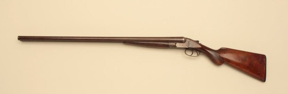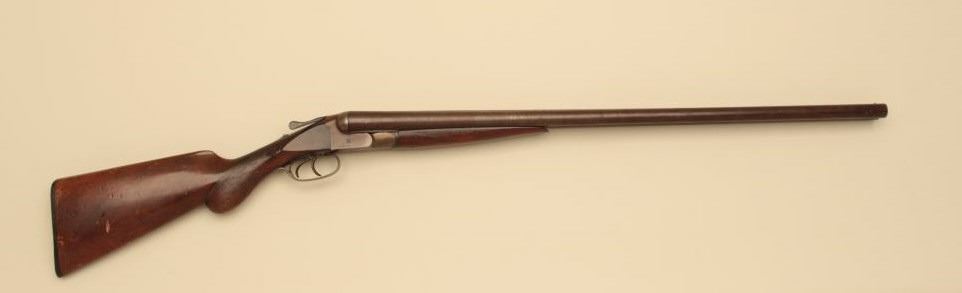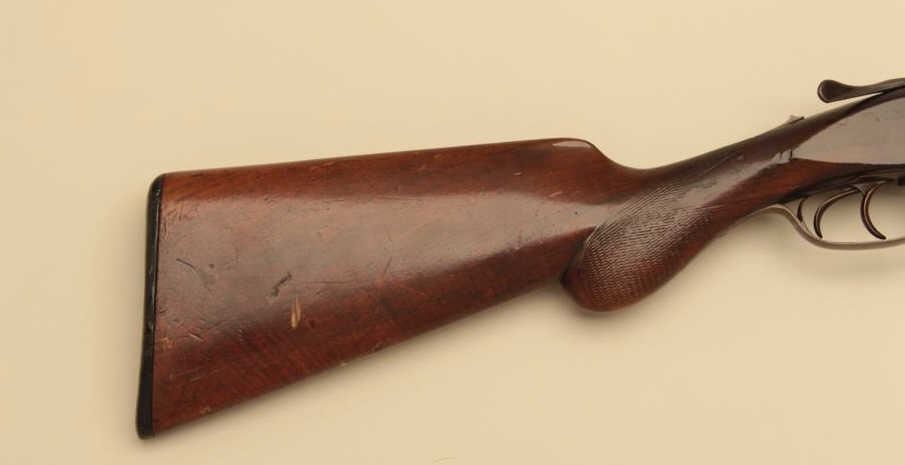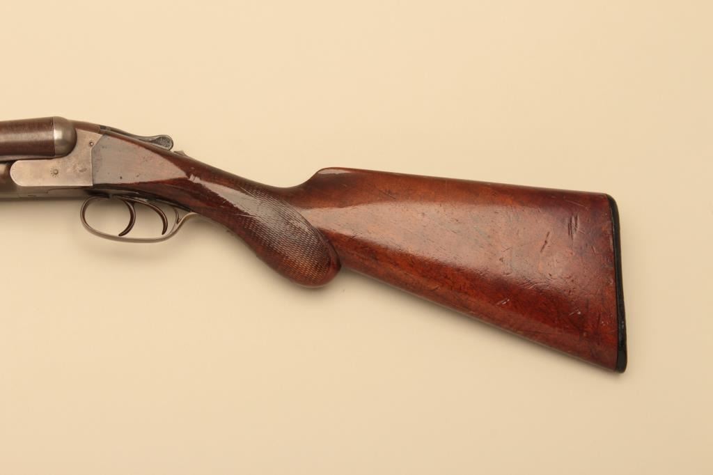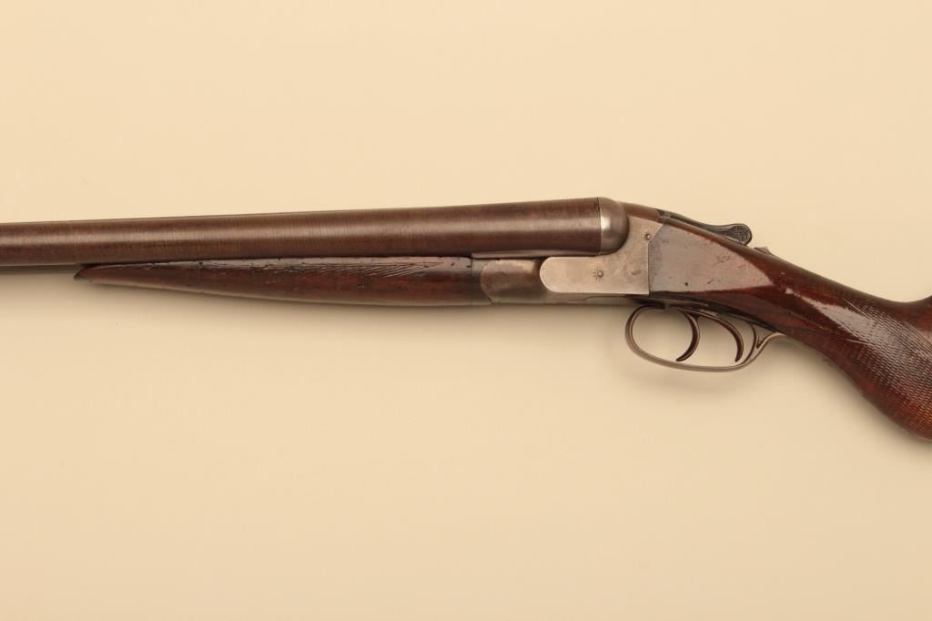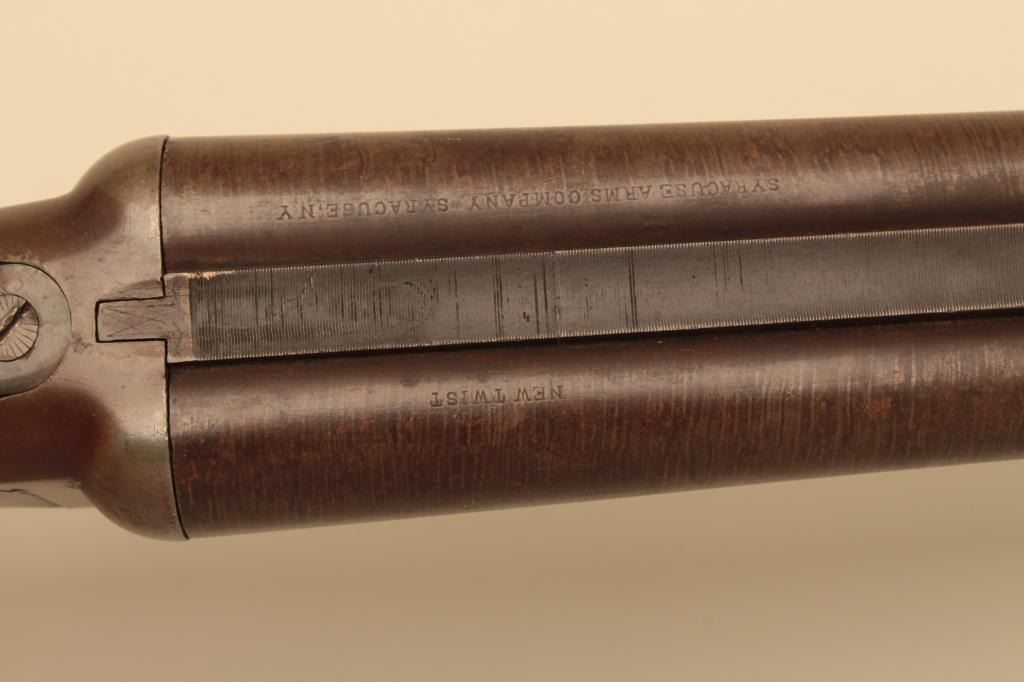 Syracuse Arms Co. SxS Damascus shotgun with 29 7/8” barrels, S/N 21875. Most original brown on the barrels with good pattern. Traces of case colors. The stocks have been refinished over worn checkering. Chokedcylinder. Measures 14” to the end of the plate. Good bores. Not locking properly with lever “Flipping”. (Antique) Est.: $125-$250