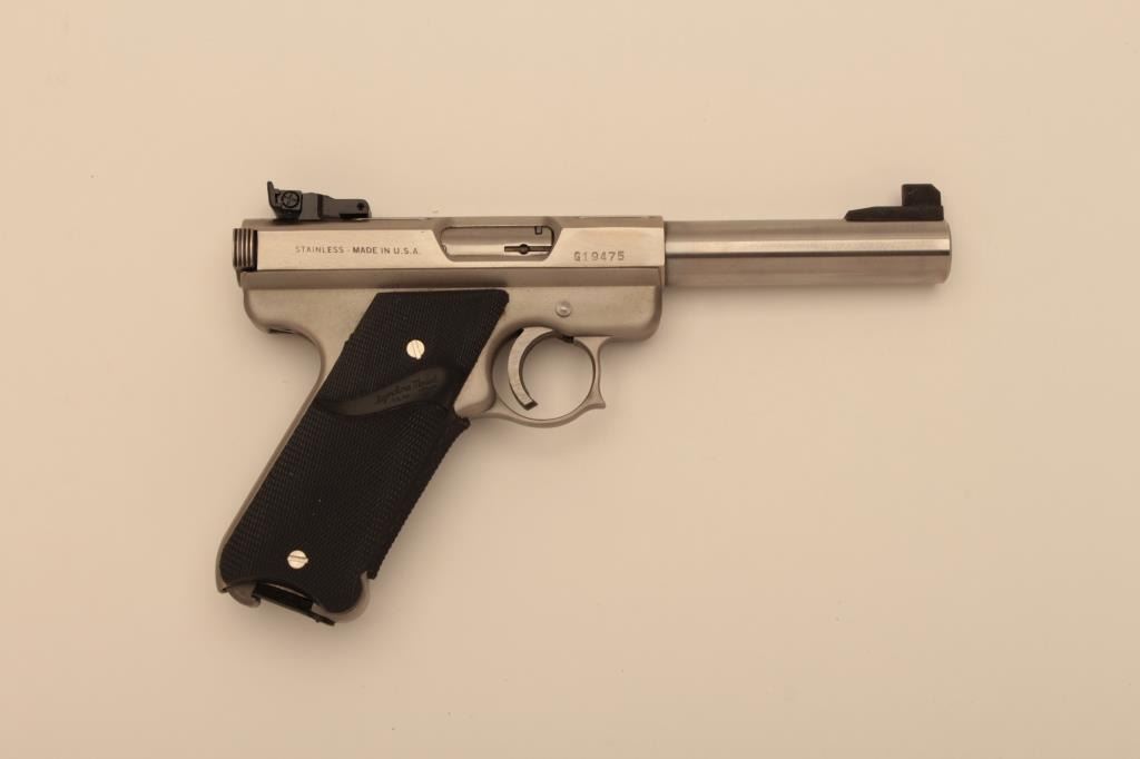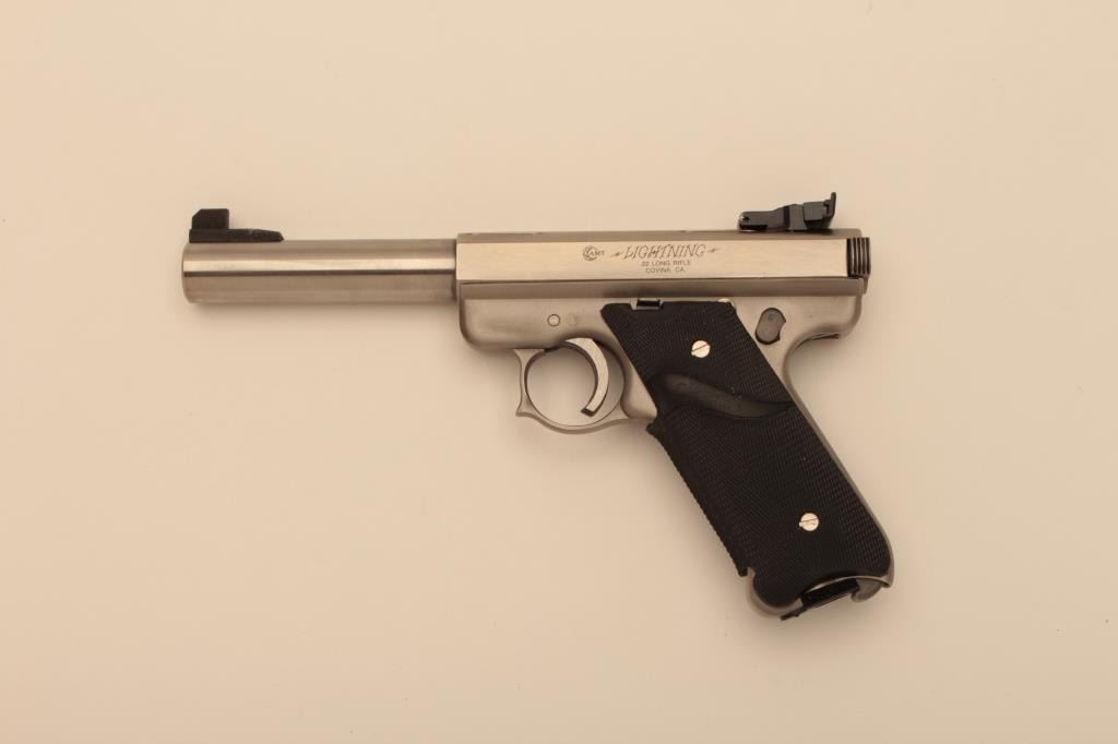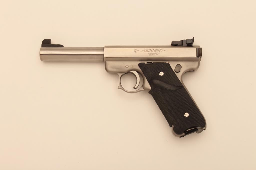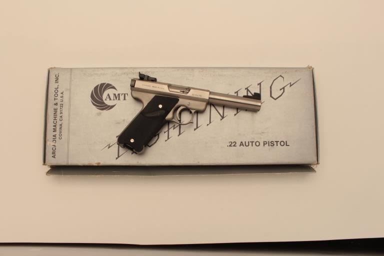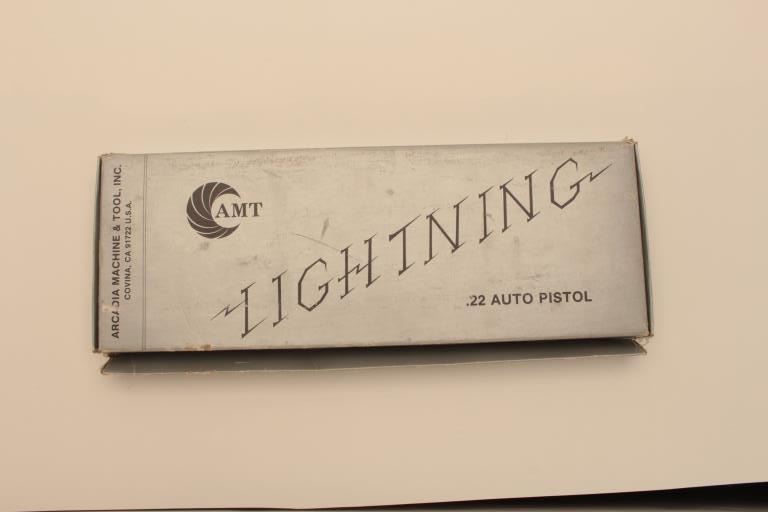 AMT (Covina, CA.) Lightning Model semi-automatic pistol, .22LR caliber, 5” barrel, stainless, Pachmayr checkered wrap around rubber grips, S/N G19475; overall like new and with factory cardboard box.(Modern/NO CAL. SALE). Est.: $400-$800.