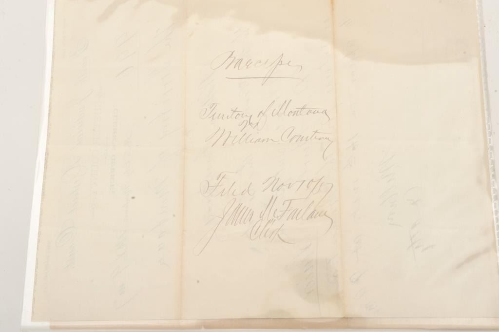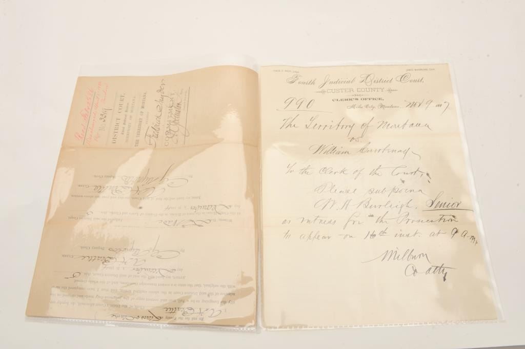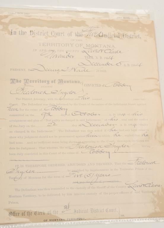 Lot of 2 original Territory of Montana Court documents including a Third Judicial District Court Prison Commitment Order dated Dec. 5, 1884, sending Frederick Snyder to prison for Robbery after his conviction by jury on Dec.2, 1884, for a term of 5 years; being remanded to the Sheriff of Lewis & Clarke County. The second original Court document on Fourth Judicial District Court letterhead (Custer County) relates to the subpoena ofwitness W. H. Burleigh, Sr. as a witness for the prosecution in the matter of the territory of Montana vs. William Courtnay; document dated Nov. 9, 1887. Est.: $75-$125.