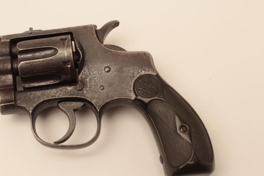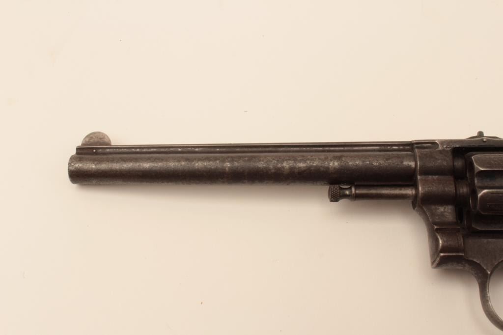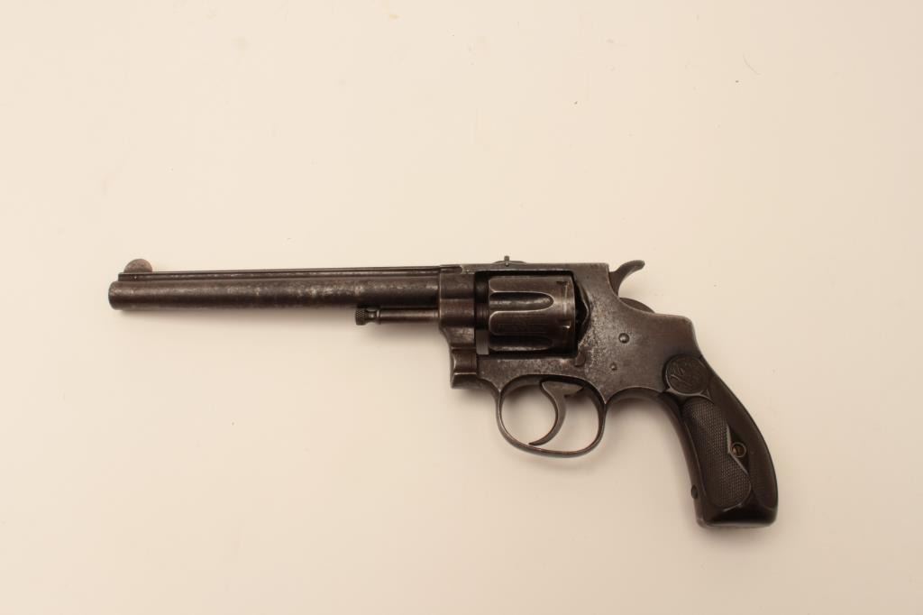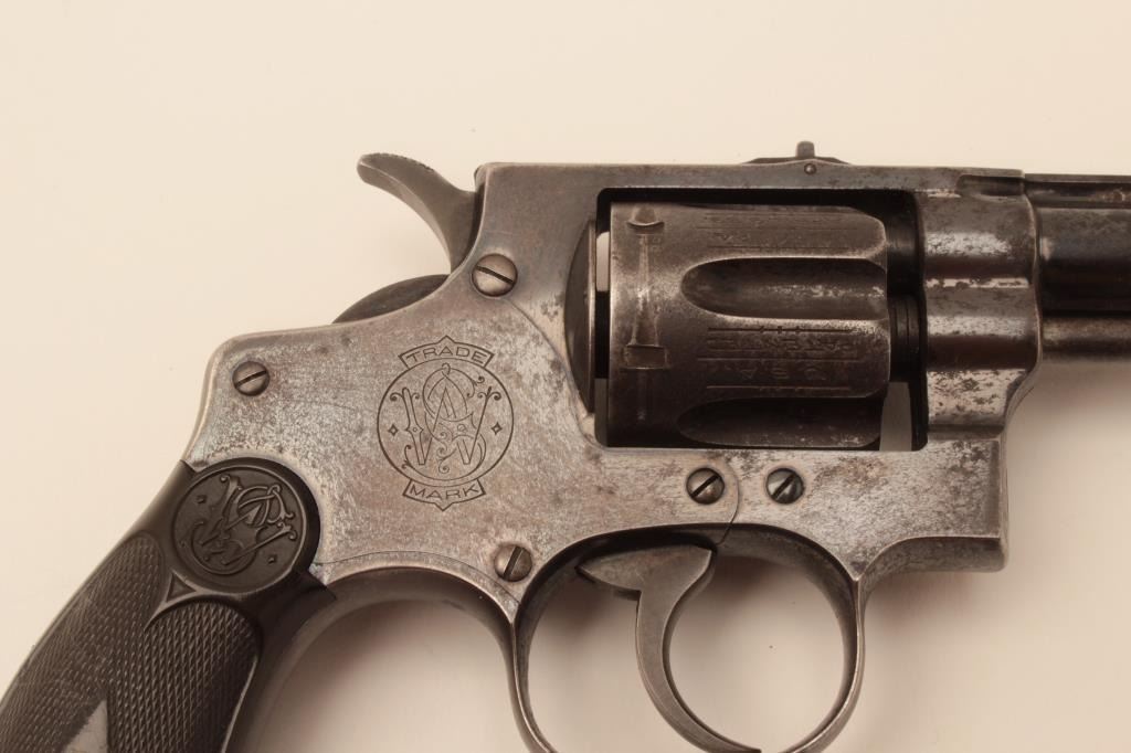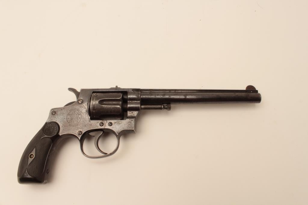 Smith & Wesson 32 hand ejector First Model DA revolver, .32 Long caliber, 6” barrel, blued finish, checkered hard rubber grips, S/N 10340; overall very good condition showing areas of original blued finish mixed withbrown patina and scattered un-cleaned pinprick pitting; good bore, crisp action and markings, very good grips. (C&R). Est.: $400-$800.