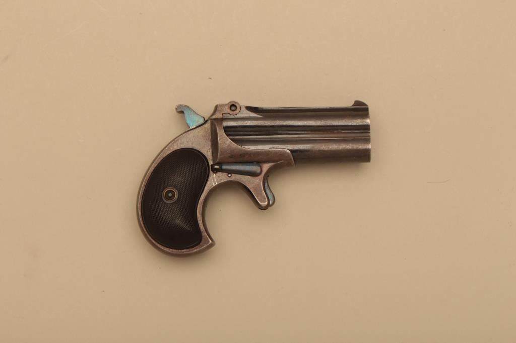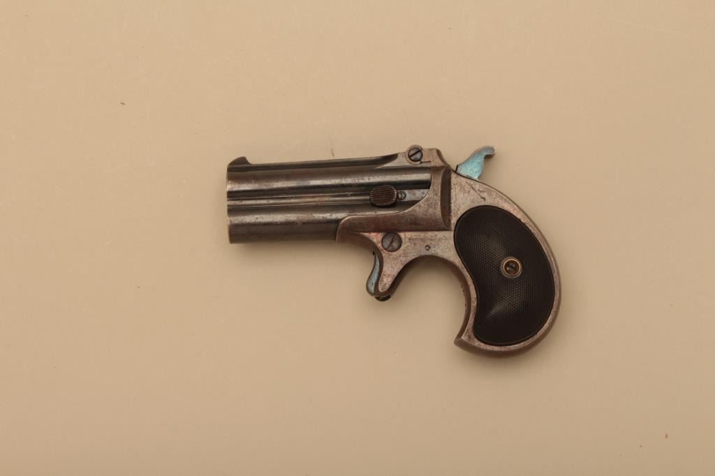 Remington Arms Co. Over/Under .41 rim Elliot’s Patent derringer in very good plus condition with desirable blue finish, S/N 95. Slant address “Remington Arm co, Ilion, N.Y”. 50%-70% bright blue evening driftingand toning with sharp surfaces. Very good grips showing slight edge wear. Excellent bore. Fine hinge. Shows no abuse and well cared for. (Antique) Est.: $600-$1200
