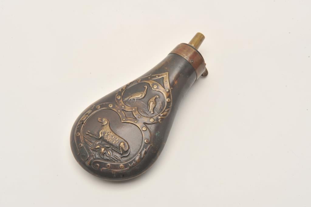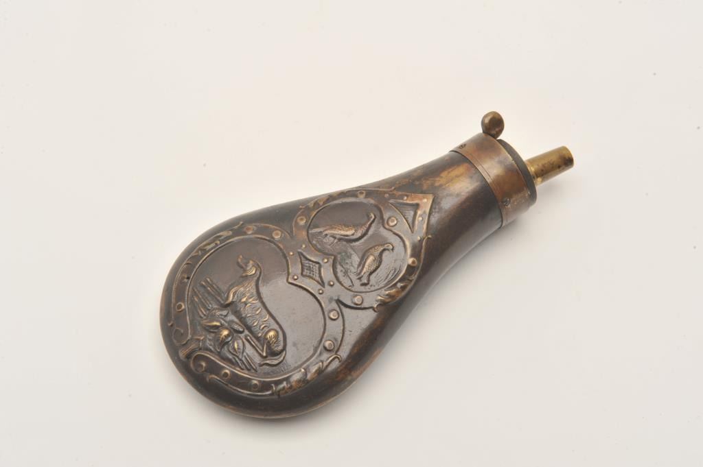 Original Remington “Dog” flask with short bent spout for Navy size revolver of .36 caliber. 50%-70% Japaned lacquer finish with patina on the top and most darkened blue on the spring. Good seams and no major dents.Est.: $175-350