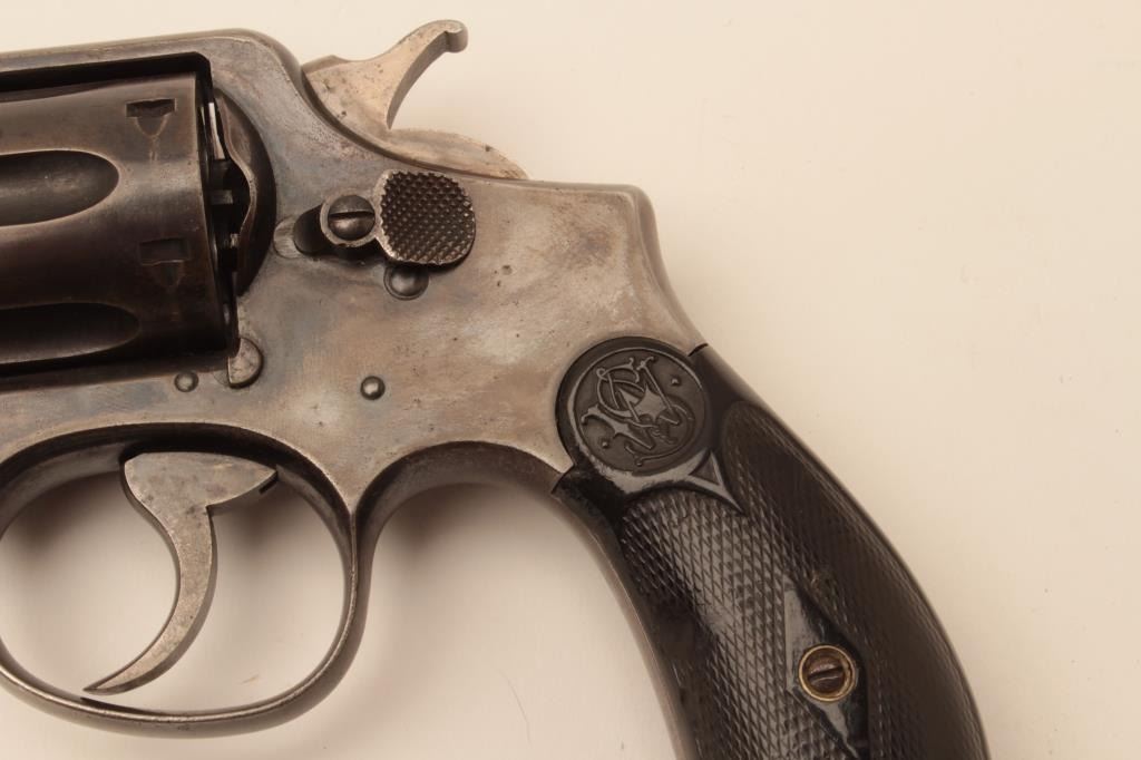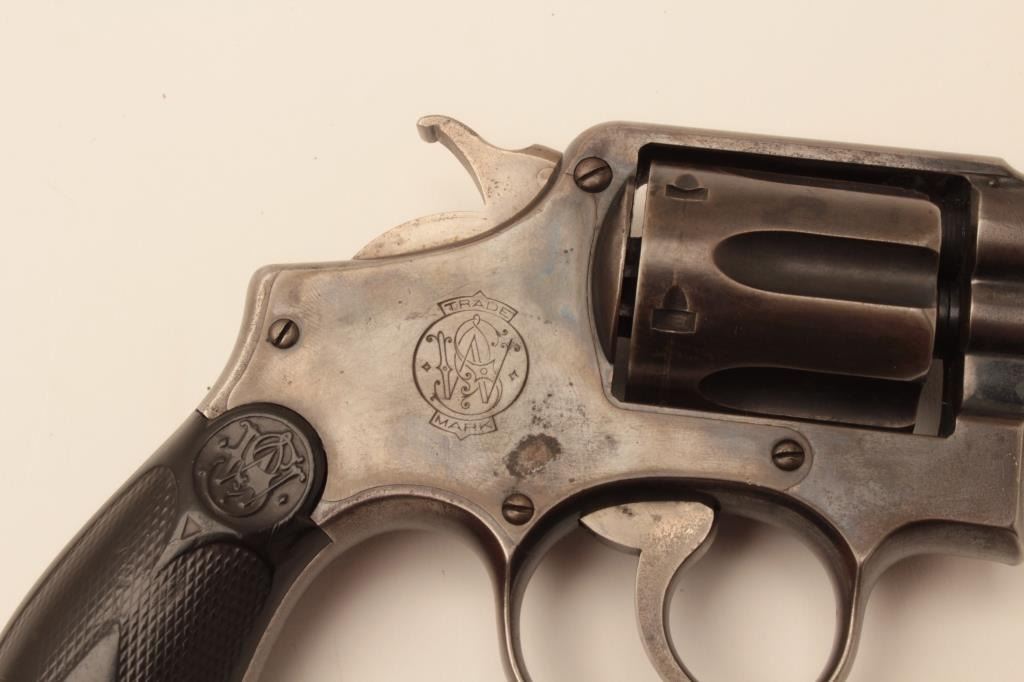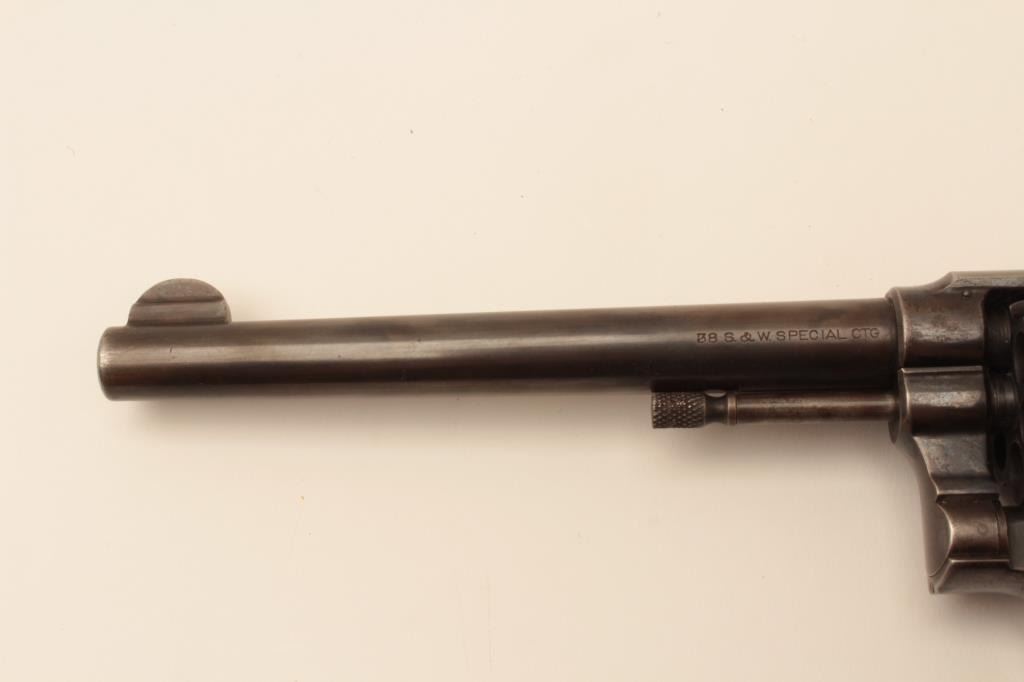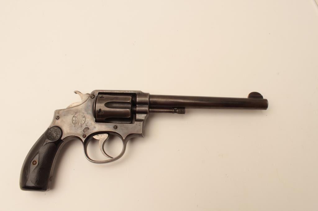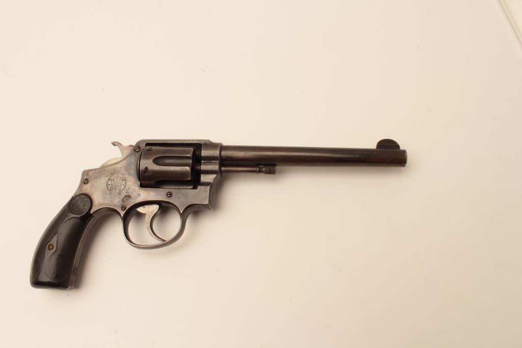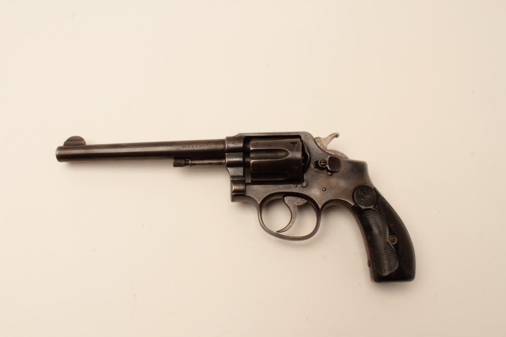 Smith & Wesson pre-Model 10 hand ejector DA revolver, .38 Special, 6.5” barrel, blued finish, checkered hard rubber grips, S/N 15387; overall good condition with traces of muted blued finish mixed with brown patina to metal surfaces, good bore, crisp action, good markings and overall good grips. (C&R). Est.: $300-$600.